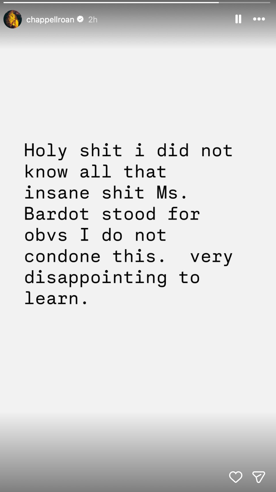 לאחר הגילוי הזה, רואן ביקשה להתנצל: "לעזאזל, לא ידעתי את כל השטויות המטורפות שבארדו תמכה בהן", היא כתבה באינסטגרם, "אני לא תומכת בזה. מאוד מאכזב ללמוד זאת".