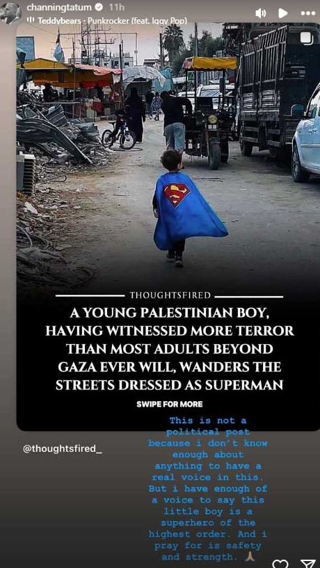 וזה לא שטייטום נמנע מלהביע את דעתו על הסכסוך - ביולי 2025 הוא פרסם בסטורי תמונה של ילד פלסטיני עם תחפושת סופרמן, לצד הכיתוב: "ילד פלסטיני צעיר, שחזה בטרור יותר מרוב המבוגרים מחוץ לעזה אי-פעם, משוטט ברחובות לבוש כסופרמן". השחקן ציין שמדובר "לא בפוסט פוליטי, כי אני לא יודע מספיק על הנושא כדי שיהיה לי קול אמיתי בזה", אבל הבהיר כי הקול שלו מספיק כדי לומר ש"הילד הקטן הזה הוא גיבור-על מהסוג הגבוה ביותר, ואני מתפלל לביטחונו".