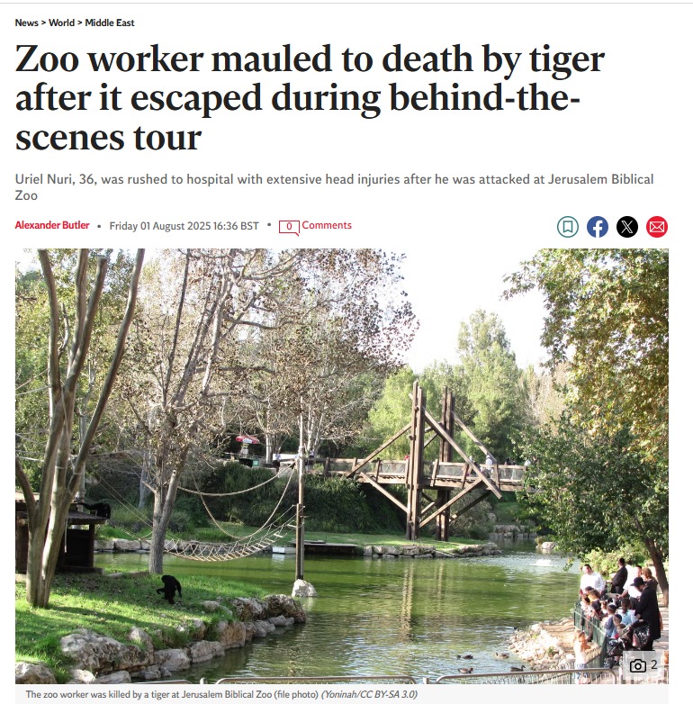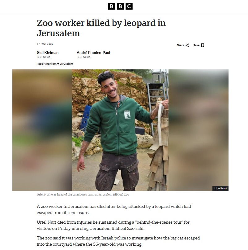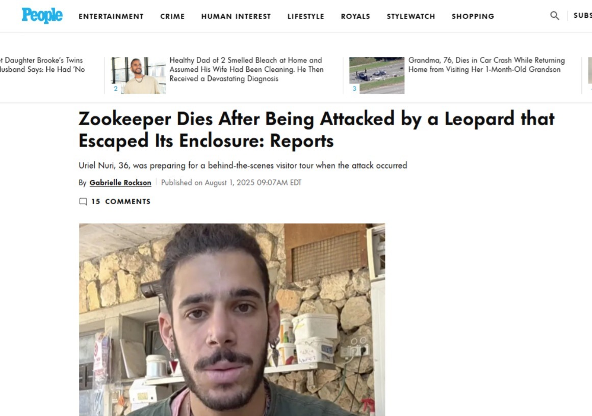 באתרי החדשות ברחבי העולם סיקרו את האירוע המזעזע בירושלים, שבו נהרג אוריאל נורי בן ה-27, לאחר שהותקף על ידי נמר שבו טיפל