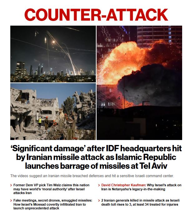 בכותרת הראשית של אתר ה"ניו יורק פוסט" נכתב על התקיפות של איראן כי נגרם "נזק משמעותי", לצד תיעוד רב של הנזק שגרמו הטילים. במקביל ב"ניו יורק פוסט ממשיכים לעסוק גם בתקיפות הישראליות בשטח איראן. "מרגלים ישראלים הבריחו טילים והחביאו בסתר רחפנים נפיצים עמוק בתוך איראן", נכתב בכתב בפוסט על פעילות המוסד, "בסדרה של מבצעים חשאיים שהובילו למתקפה הקטלנית ביום שישי - לפני שרימו מנהיגים צבאיים להתכנס לפגישה כדי שניתן יהיה לחסל אותם".