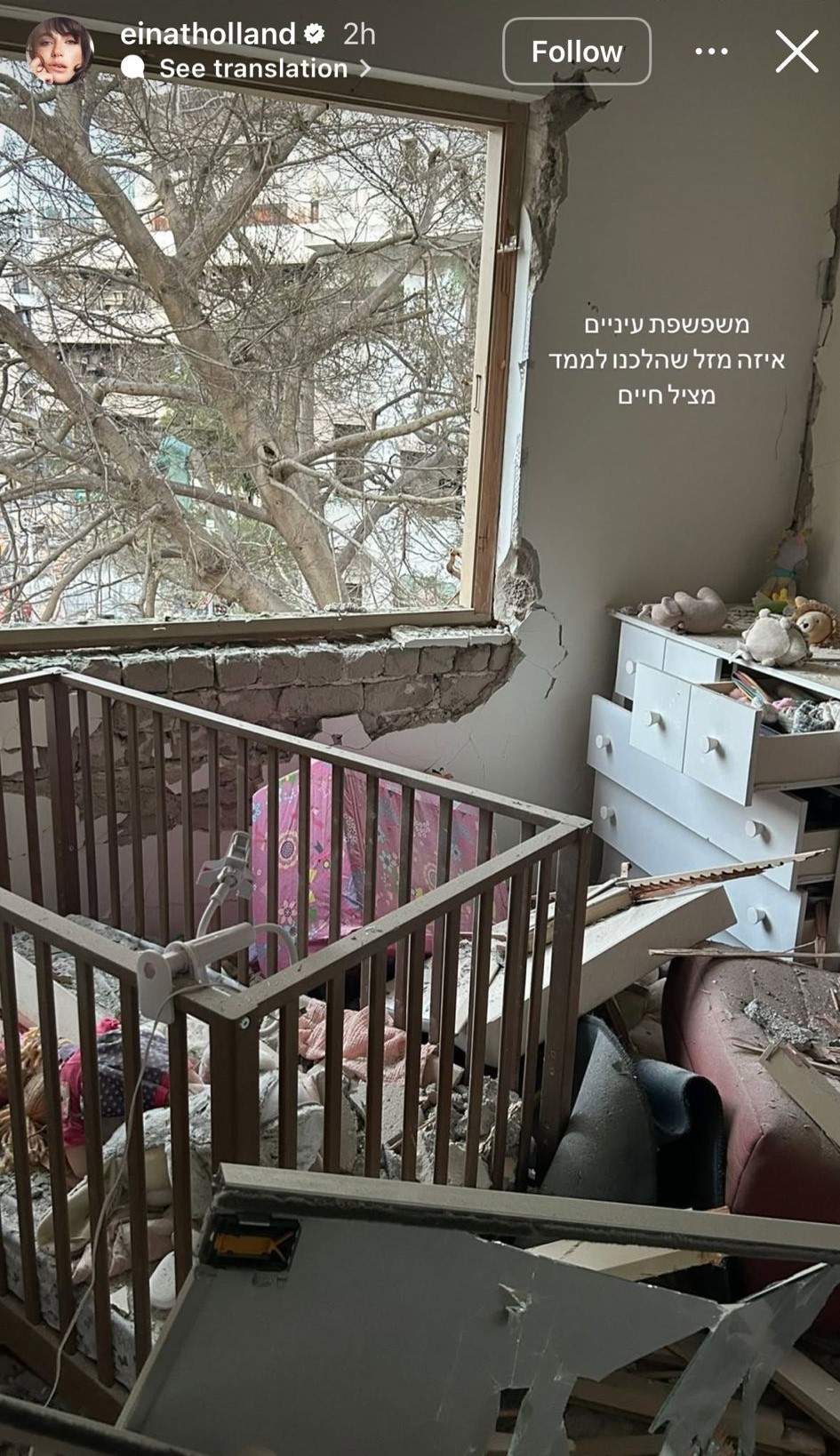 בתמונות שפרסמה, נראה הסלון והחדר של הילדה הרוסים לחלוטין - וגם הבתים הנראים מהחלון ניזוקו מאוד: "אני משפשפת עיניים, איזה מזל שהלכנו לממ"ד. מציל חיים", כתבה. "הבית הלך קפוט, אנחנו אצל משפחה, מתאוששים. תודה לכולם על הדאגה, אתם מרגשים אותי ברמות - העיקר שכולם בסדר. תקשיבו להנחיות פיקוד העורף, זה מציל חיים".