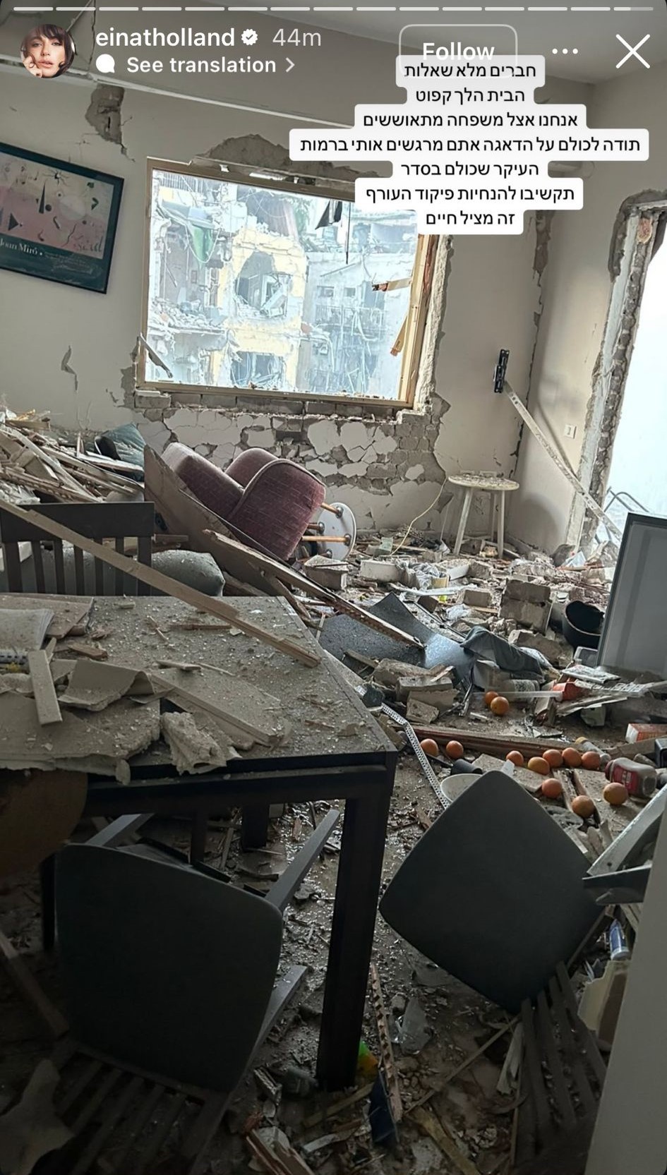 "הייתה אזעקה, יצאנו מהר למקלט תת-קרקעי", סיפרה הולנד, "שמענו הדף מטורף והלך לנו הבית. הכל, הכל, הכל. אני עושה את הסטורי הזה כי הטלפון שלי מתפרק בהודעות, אז הכל בסדר. כולנו בסדר, אבל הלך הבית. משהו וואו, איזה מטורף. טוב, בסדר, בשורות טובות לכולם".