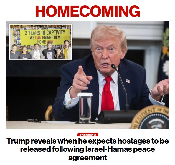 בניו יורק פוסט התמקדו בכותרת הראשית בחזרה הצפויה של החטופים, תחת הכותרת "חזרה הביתה" - והוסיפו: "טראמפ צופה כי החטופים ישוחררו עד יום שני, אחרי שתיווך הסכם שלום פורץ דרך".