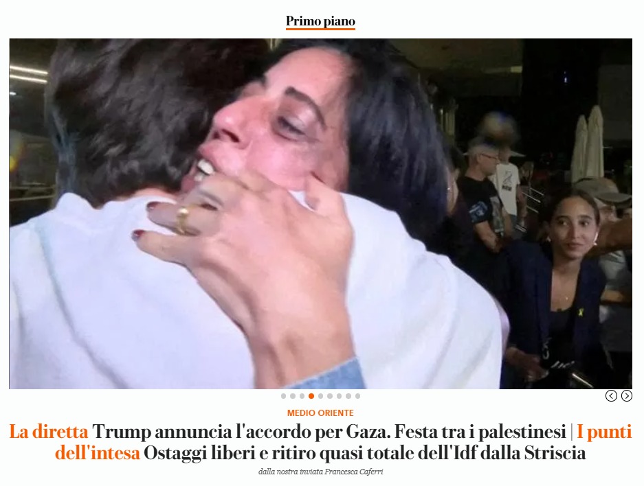 ב"לה רפובליקה" האיטלקי הציגו את החגיגות בישראל לצד חגיגות של פלסטינים בעזה, ופרסו את "הנקודות המרכזיות" בהסכם כשהם מציינים זה לצד זה את שחרור החטופים ואת נסיגת צה"ל מרצועת עזה.
