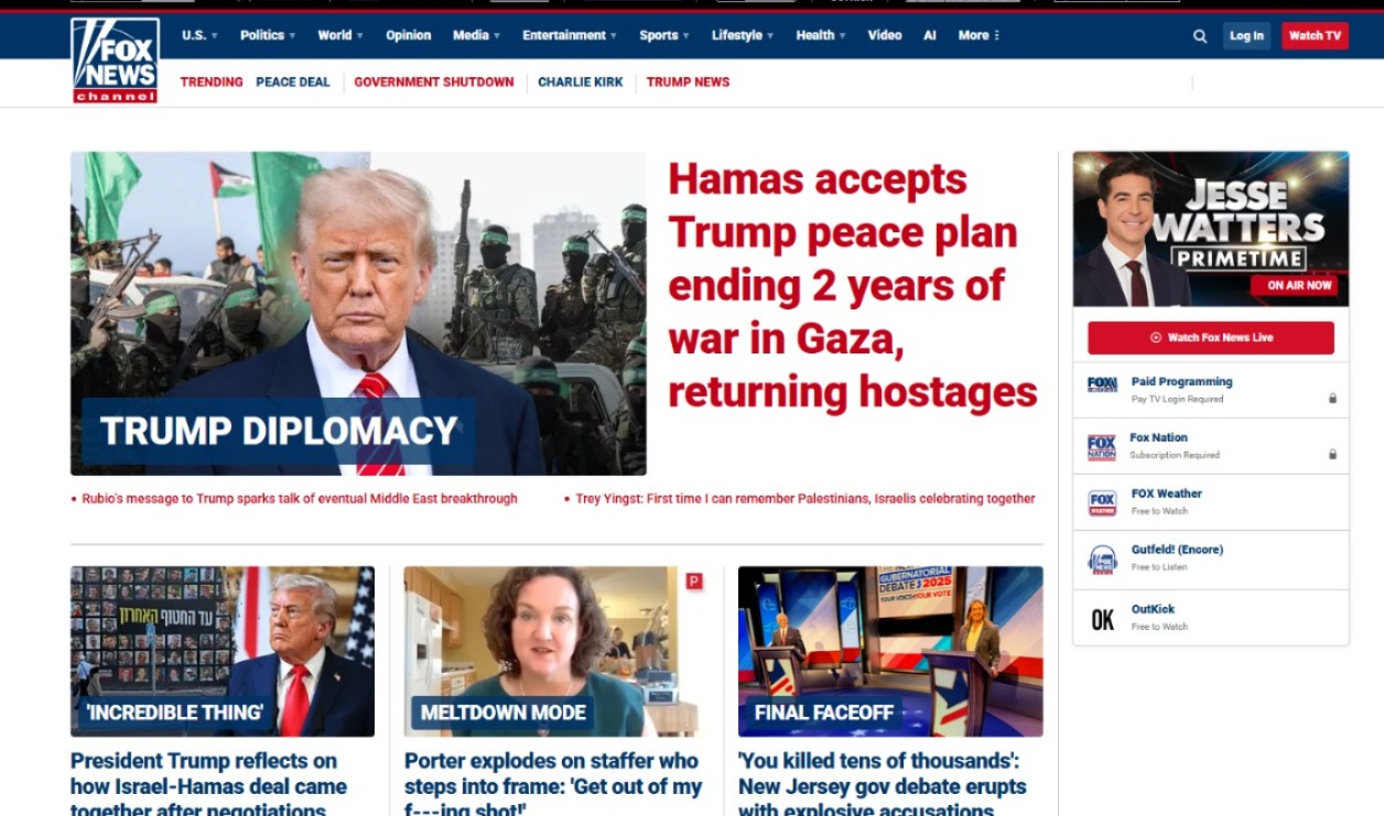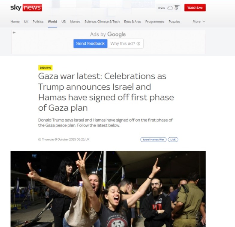 בפוקס ניוז כתבו: "חמאס מקבל את תוכנית השלום של טראמפ, שמסיימת שנתיים של מלחמה בעזה ומחזירה את החטופים"; "חגיגות בעקבות הכרזת טראמפ על אישור השלב הראשון בתוכנית לעזה", כתבו בסקיי ניוז, "הנשיא הודיע כי ישראל וחמאס חתמו על השלב הראשון בתוכנית השלום בעזה".