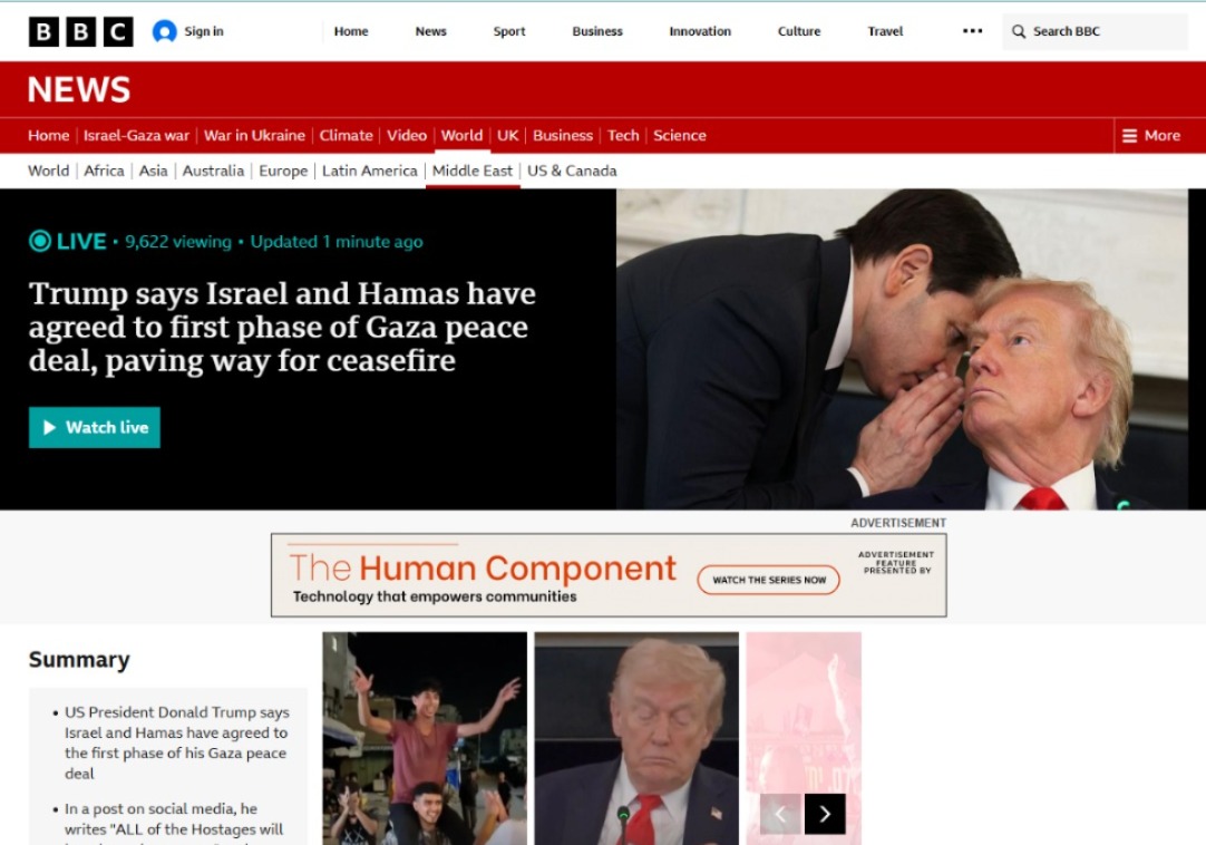 "ישראל וחמאס מסכימות על השלב הראשון בתוכנית הפסקת האש בעזה", כתבו ב-CNN, ואילו ב-BBC, שעדכנו גם הם רגע אחרי רגע, הביאו לכתבה את הכותרת: "טראמפ אומר שישראל וחמאס הסכימו על השלב הראשון בעסקת השלום בעזה, מה שסולל את הדרך להפסקת אש".