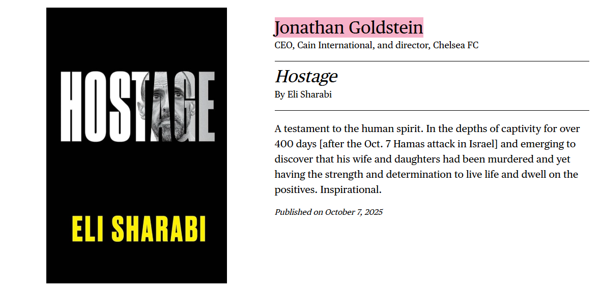 הספר מופיע ברשימה תחת קטגוריית "הישרדות". ג'ונתן גולדשטיין, איש העסקים היהודי-בריטי, ממייסדיה ובעליה של חברת המקרקעין Cain International ואחד מבעלי מועדון הכדורגל צ'לסי, כתב על ספרו של שרעבי: "זו עדות לרוח האנושית. להיות בעומק השבי במשך יותר מ-400 ימים (לאחר מתקפת חמאס ב-7 באוקטובר בישראל), ולצאת ממנו כדי לגלות שאשתו ובנותיו נרצחו - ובכל זאת הוא מוצא את הכוח והנחישות להמשיך לחיות ולהתמקד בחיובי. מעורר השראה".