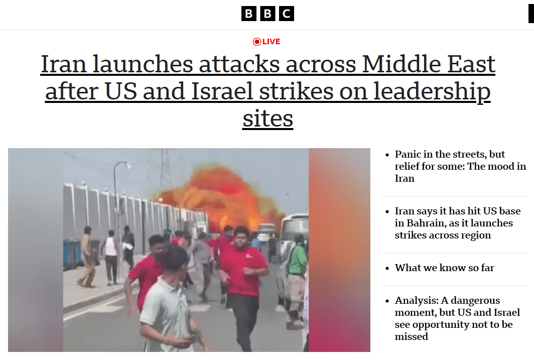 "פאניקה ברחובות": המתקפה המשולבת של ישראל וארצות הברית על איראן, שבעקבותיה ירו ברפובליקה האיסלאמית מאות טילים לישראל ומדינות נוספות באזור, תופסת היום (שבת) מאז שעות הבוקר את ראש הכותרות בכל כלי התקשורת מסביב לעולם. האתרים וערוצי החדשות מסקרים מסביב לשעון את ההתפתחויות האחרונות, תוך התמקדות בממדי ההרס באיראן ובישראל - וכן ביעדים מפרציים נוספים שהותקפו אף הם.