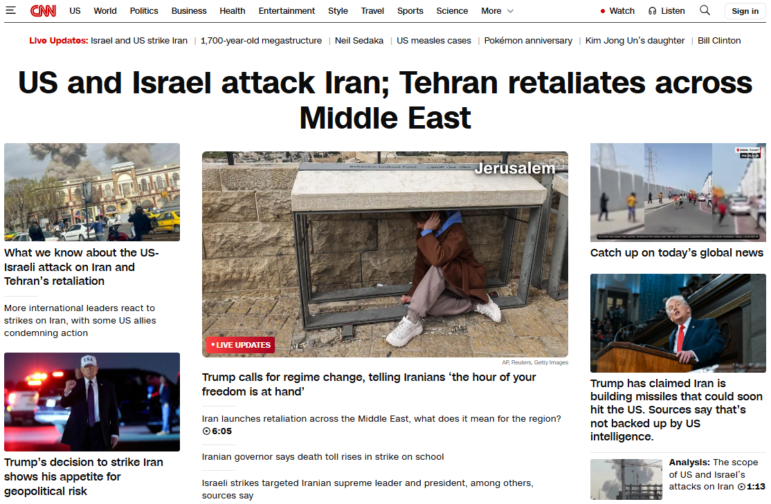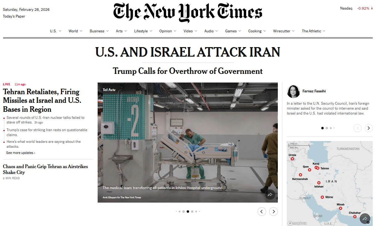 עמוד הבית של רשת החדשות CNN מוקדש כולו להתפתחויות האחרונות במלחמה, ולצד התיעודים מהזירות השונות מובא גם טור פרשנות הטוען כי "ההחלטה של טראמפ לתקוף באיראן מראה את התיאבון שלו לסיכון גאופוליטי". ידיעה אחרת מטילה ספק בטענת הנשיא האמריקאי על כך שבאיראן פיתחו נשק שעשוי להגיע לארצות הברית, ואחת נוספת מתמקדת בנזק שנגרם בבית ספר איראני במהלך המתקפה. באתר הרשמי של הניו יורק טיימס, בינתיים, מוצגת תמונה מההיערכות המיוחדת בבית החולים איכילוב שבתל אביב, תחת הכותרת הבולטת "ארצות הברית וישראל תוקפות את איראן".