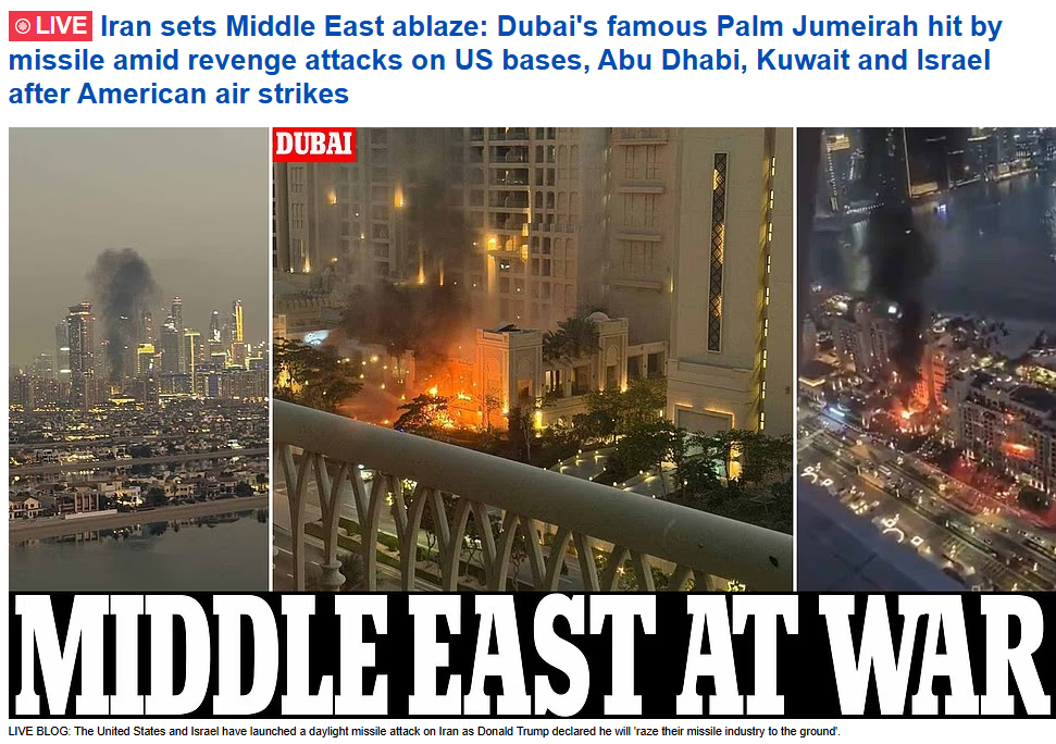 גם בצהובון הדיילי מייל הבריטי בחרו ללוות את סיקור המלחמה בכותרת בולטת - ומעט יותר דרמטית: "המזרח התיכון במלחמה", נכתב לצד תמונות מהתקיפה האיראנית בדובאי, שגרמה לנזק באחד מהמלונות הידועים באמירות. הפיצוץ באי פאלם ג'ומיירה מלווה גם את הכותרת הראשית של צהובון הבילד הגרמני, בעוד שבאתר הבית של ה-BBC חלק ניכר מתשומת הלב מוקדש להשפעות התקיפה על איראן. "פאניקה ברחובות, אבל הקלה לחלק מהאנשים", נכתב באחת מהכותרות המרכזיות על הלך הרוח במדינה.