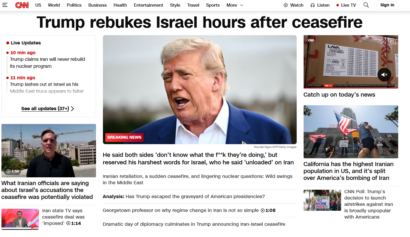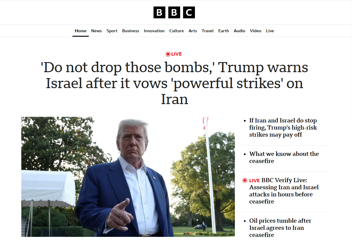 באתר ה-BBC כתבו: "טראמפ מזהיר את ישראל: 'אל תטילו את הפצצות האלה' - לאחר שישראל התחייבה ל'תקיפות עוצמתיות' נגד איראן"; ב-CNN הגדילו לעשות שכתבו כי טראמפ "נוזף בישראל שעות אחרי הפסקת האש", ואז בכותרת המשנה הוסיפו עוד כי "הנשיא אמר ששני הצדדים 'לא יודעים מה לעזאזל' הם עושים - אך שמר את דבריו החריפים ביותר לישראל, שלדבריו 'הפציצה את איראן בלי אבחנה'".