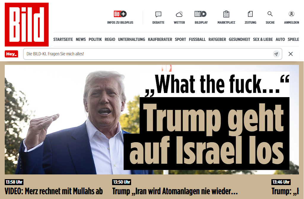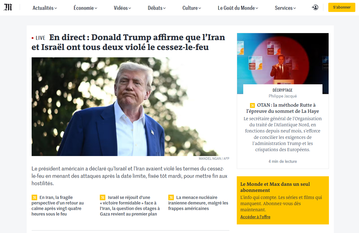 בלה מונד הצרפתי כתבו ש"דונלד טראמפ טוען כי גם איראן וגם ישראל הפרו את הפסקת האש", והסבירו עוד: "נשיא ארה"ב הצהיר שישראל ואיראן הפרו את תנאי הפסקת האש כאשר ביצעו תקיפות לאחר המועד האחרון"; בבילד הגרמני הביאו את הציטוט "וואט דה פאק", והוסיפו: "טראמפ פתאום יוצא נגד ישראל"; וב-CBS ניוז ציטטו מדבריו של הנשיא שאמר כי הוא "לא מרוצה" על שהצדדים הפרו את הפסקת האש.
