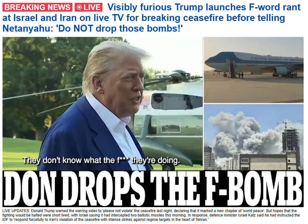 בדיילי מייל הלכו על כותרת יצירתית ודו משמעית, כשכתבו: "טראמפ לחץ על פצצת ה-F" - כלומר, אמר את המילה "פאק". בכותרת היותר אינפורמטיבית, הסבירו: "טראמפ זועם מול המצלמות - מטיח קללות בישראל ובאיראן על הפרת הפסקת האש, ואומר לנתניהו 'אל תטיל את הפצצות האלה!"; בפוקס ניוז כתבו שבעודו עושה את דרכו לוועידת נאט"ו, הנשיא "תוקף את איראן וישראל לאחר שהפרו את הפסקת האש".