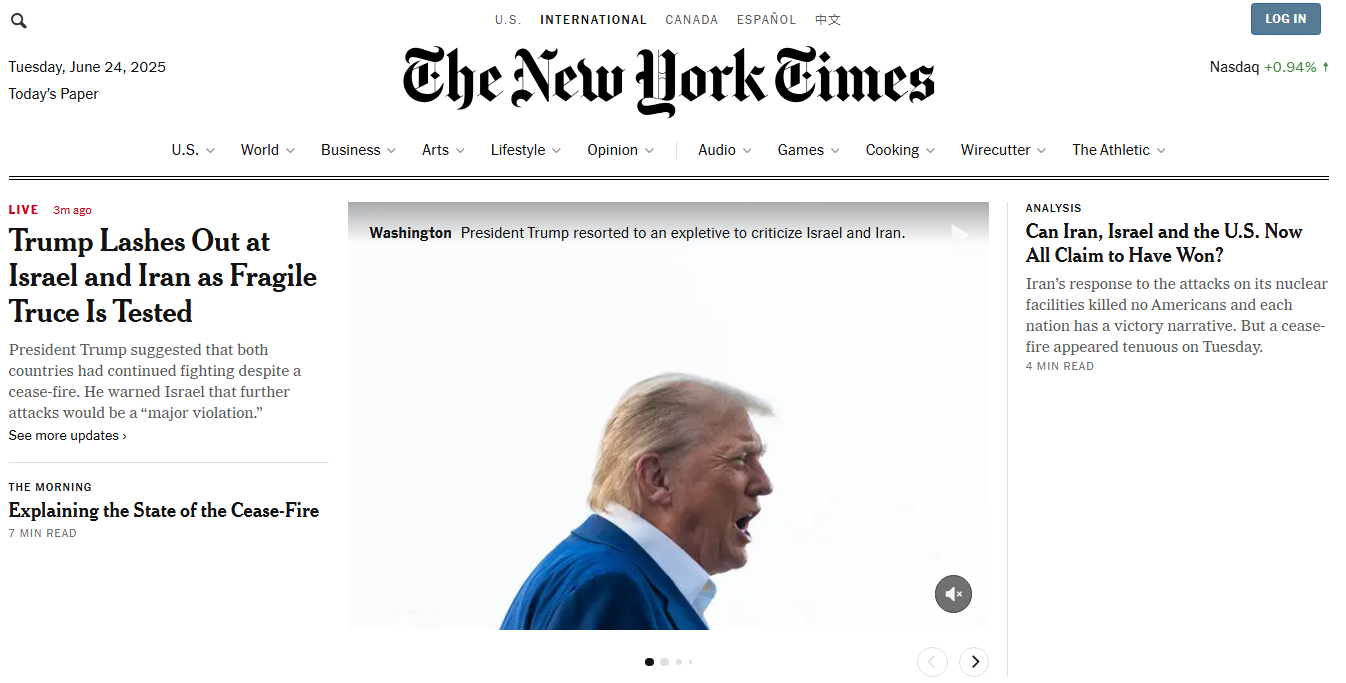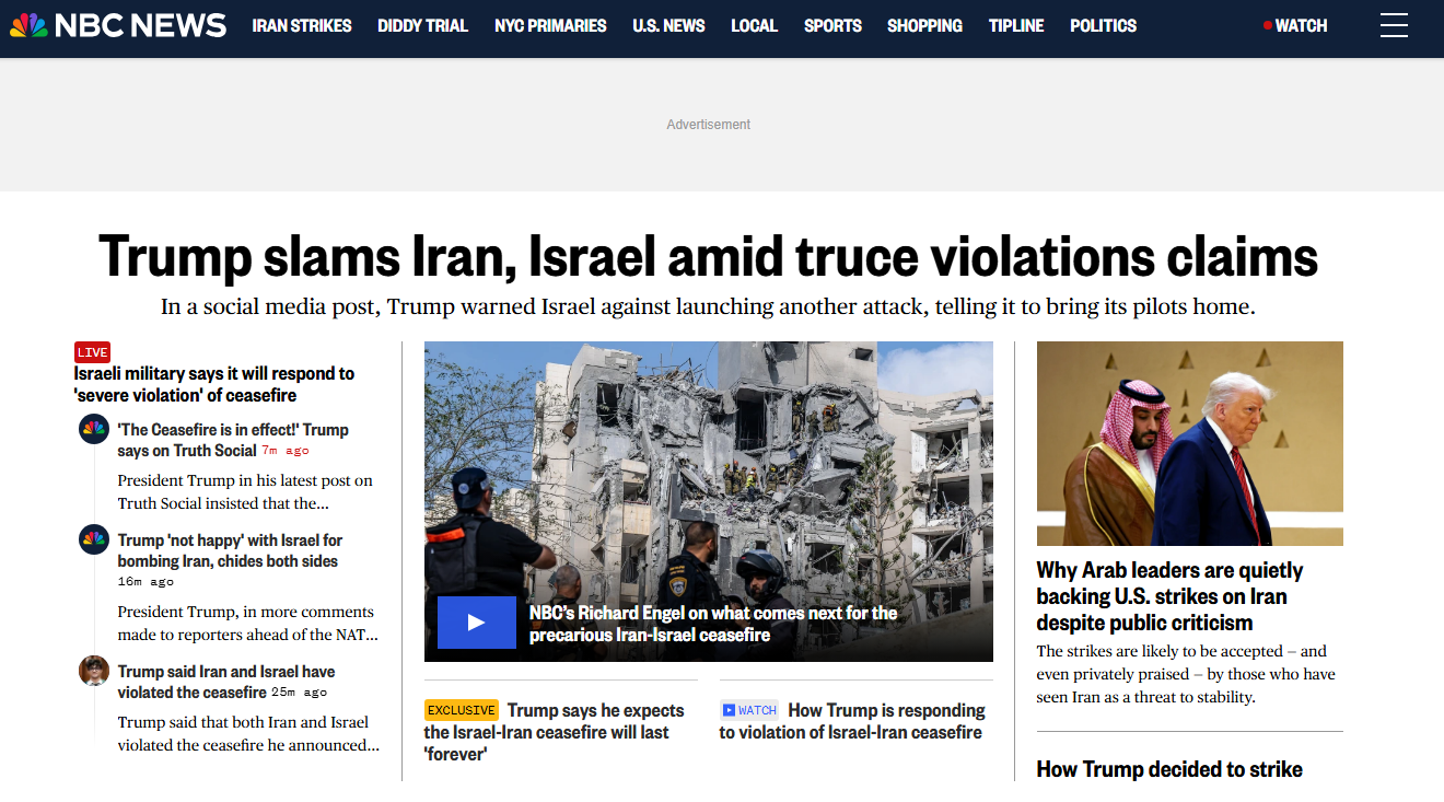 כמו אצלנו, גם ברחבי העולם הכותרת המרכזית של היום היא הפסקת האש בין ישראל לאיראן, שהושגה אחרי 12 ימי לחימה מתוחים. אתרי החדשות סיקרו את האירועים בהרחבה, עם עדכונים שוטפים דקה אחר דקה, ואז בצהריים - נשיא ארה"ב דונלד טראמפ עלה להתקפה, כשהאשים את שני הצדדים בהפרת ההסכם. תמונתו, עם אצבע מאשימה, כיכבה בעמודים הראשיים, תחת הכותרת עם המסר ששיגר בעיקר לישראל: אל תעזו לתקוף שוב.