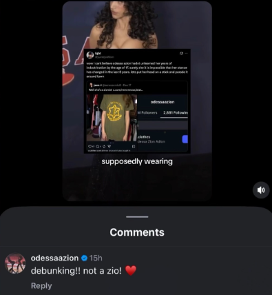 לאחר כל הרחש ברשת, א'זיון הגיבה בעצמה ושמה סוף לשמועות: "אני לא זיו (ציונית)", כתבה השבוע בתגובה לפוסט שבו דנו על דעותיה הפוליטיות. בפוסט נוסף, שבו דווח על המחלוקת, היא הרחיבה: "אני לא תומכת בצה"ל או בנתניהו בשום צורה! הלוואי שהייתי יודעת את משמעות החולצה ההיא כשהייתי ילדה. לצערי לא ידעתי אז, אבל עכשיו אני יודעת, וזה לא משהו שאני תומכת בו בכלל! מסיימת את זה כאן!".