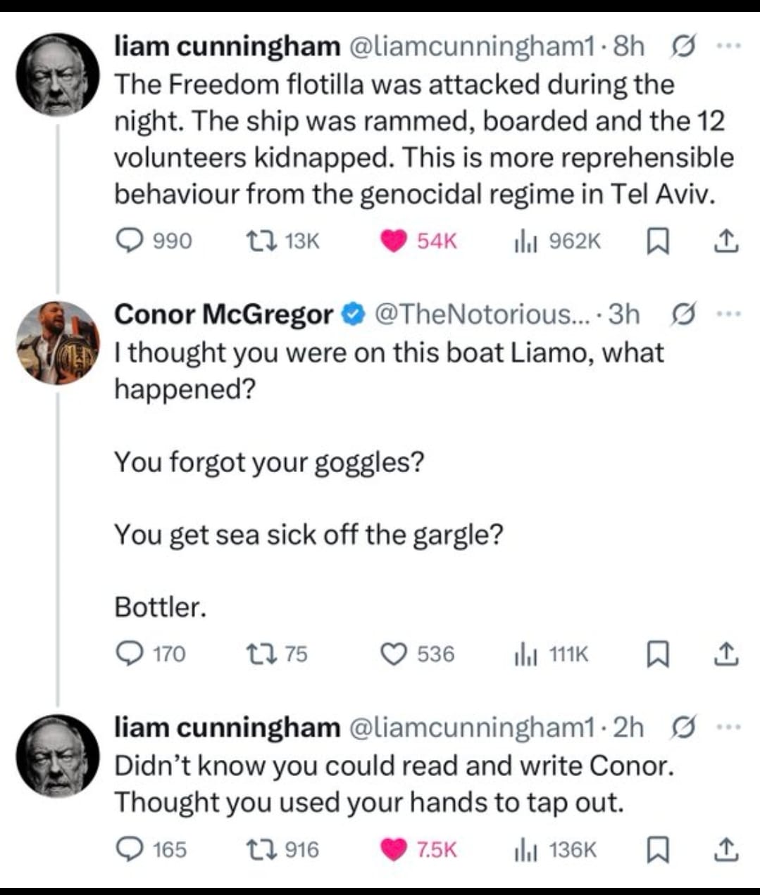 לוחם ה-MMA האירי כתב בחשבון ה-X נגד המשט וגרטה טונברג, אבל בעיקר התנגח בשחקן ליאם קנינגהם, ולעג על כך שבכלל לא הצטרף למשט המדובר - שנעצר על ידי כוחות צה"ל. השחקן הגיב: "לא ידעתי שאתה יודע לקרוא ולכתוב קונור"