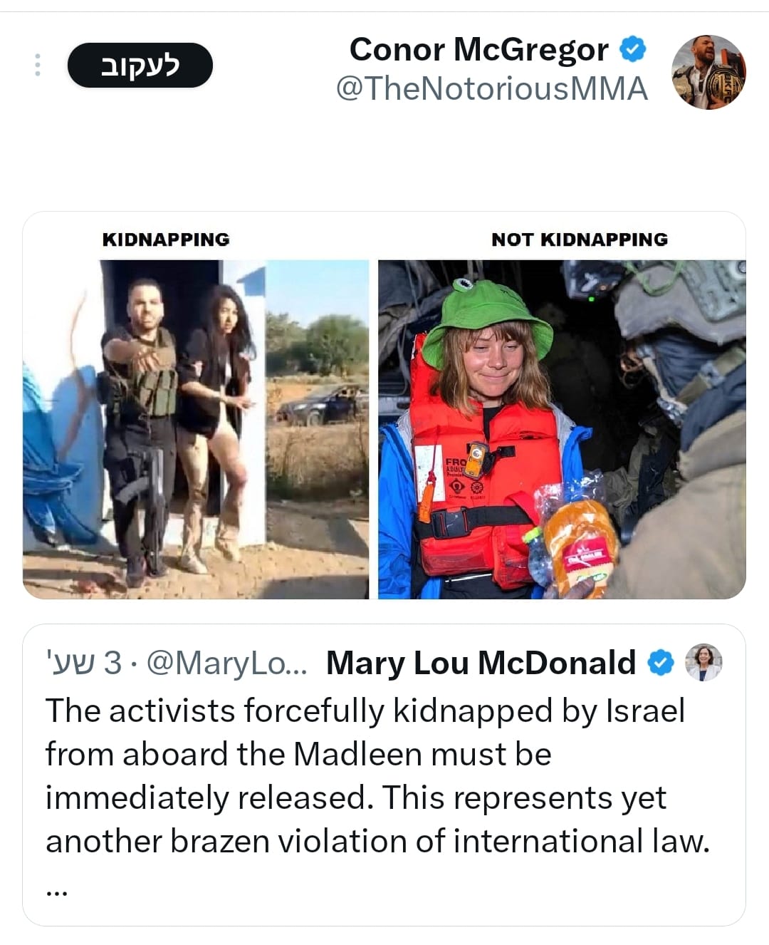 באשר לפעילת האקלים, שתועדה מחייכת לחיילי צה"ל בעת שקיבלה כריך, שיתף המתאגרף האירי תמונה שלה מהרגע המדובר, לצד תיעוד של נועה ארגמני מובלת בידי מחבל חמאס ממיגונית המוות. מקגרגור, שיתף את ההשוואה בין השתיים בתגובה לציוץ שקרא לשחרור "הפעילים שנחטפו על ידי ישראל". זאת, אחרי שגם "קואליציית משט החירות" הצהירה כי המשט, שסוקר בהרחבה בכותרות בעולם, "נחטף על ידי כוחות ישראליים" בעת שניסו לספק סיוע לאזור הנצור.