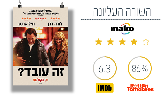 "זה עובד?" הוא בעיניי סרט-אח מושלם ל"סיפור נישואים" הנפלא של נואה באומבך. זה כאילו מובן מאליו כי שני הסרטים עוסקים בהתפרקות של זוגיות, אבל העניין הוא ש"זה עובד?" הוא ממש במובהק האח החייכן של "סיפור נישואים" העצוב. וזה לא עושה אותו פחות עמוק או פחות נוגע: היחסים בין אלכס לטס כתובים נהדר, והכימיה בין ארנט לדרן מציפה נהדר את החיבור, את השנים וגם את הקורוזיה. זה מתבטא בין השאר בסצנה שבעיניי היא המבחן הגדול ביותר של הסרט: הרגע שבו היא רואה אותו לראשונה על הבמה. כל מה שהולך שם - הולך מצוין, ולגמרי לא לכיוונים שהייתי מצפה. וכמו סצנת המפתח הזו, ככה הסרט כולו: מצחיק אבל לא מצחיק-בקול-רם, מרגש אבל לא הכינו-את-הממחטות. דרמה קומית מאוזנת, וכמה שזה דבר נדיר.