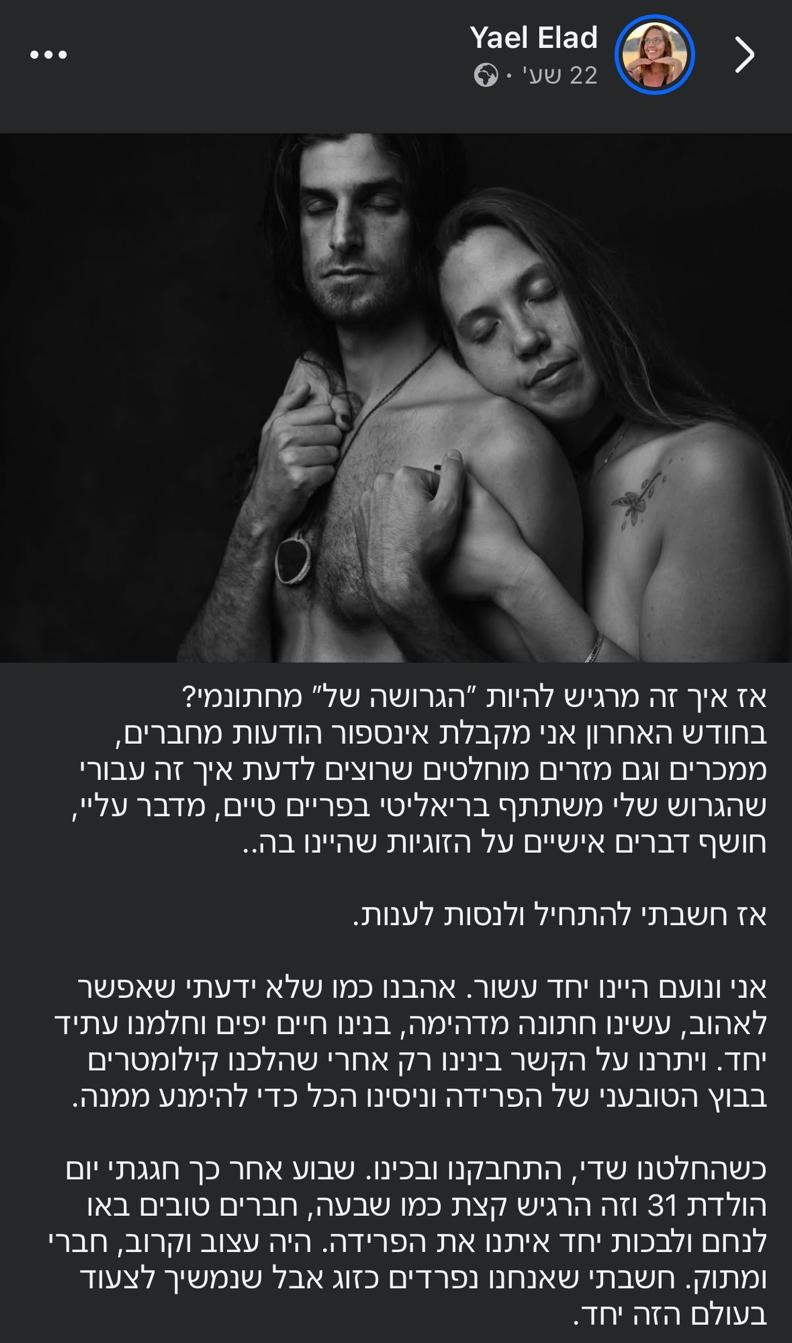 בסיום הפוסט התייחסה יעל לצפייה בבן הזוג לשעבר: "פתאום נועם חזר לחיים שלי, רואה תמונות שלו בכל מקום וקוראת פוסטים עליו. כתוצאה מזה אני חושבת עליו ונזכרת בו, מה שכמעט ולא עשיתי בשנתיים האחרונות", כתבה. "מרתק אותי לראות אותו נחשף על המסך. למרות הכעס והבחירה שלי לחיות בנתק ממנו, הייתי סקרנית לדעת מה עלה בגורלו. שמעתי שעברו עליו שנים קשות בריאותית, זוגית וחברתית - אם להיות כנה, כשסיפרו לי שהוא ברע אז אמרתי שקארמה איז א ביצ' ושאיזה באסה לו שהוא הפסיד אותי בתור חברה לחיים וצריך לעבור את כל החרא הזה בלעדיי".
