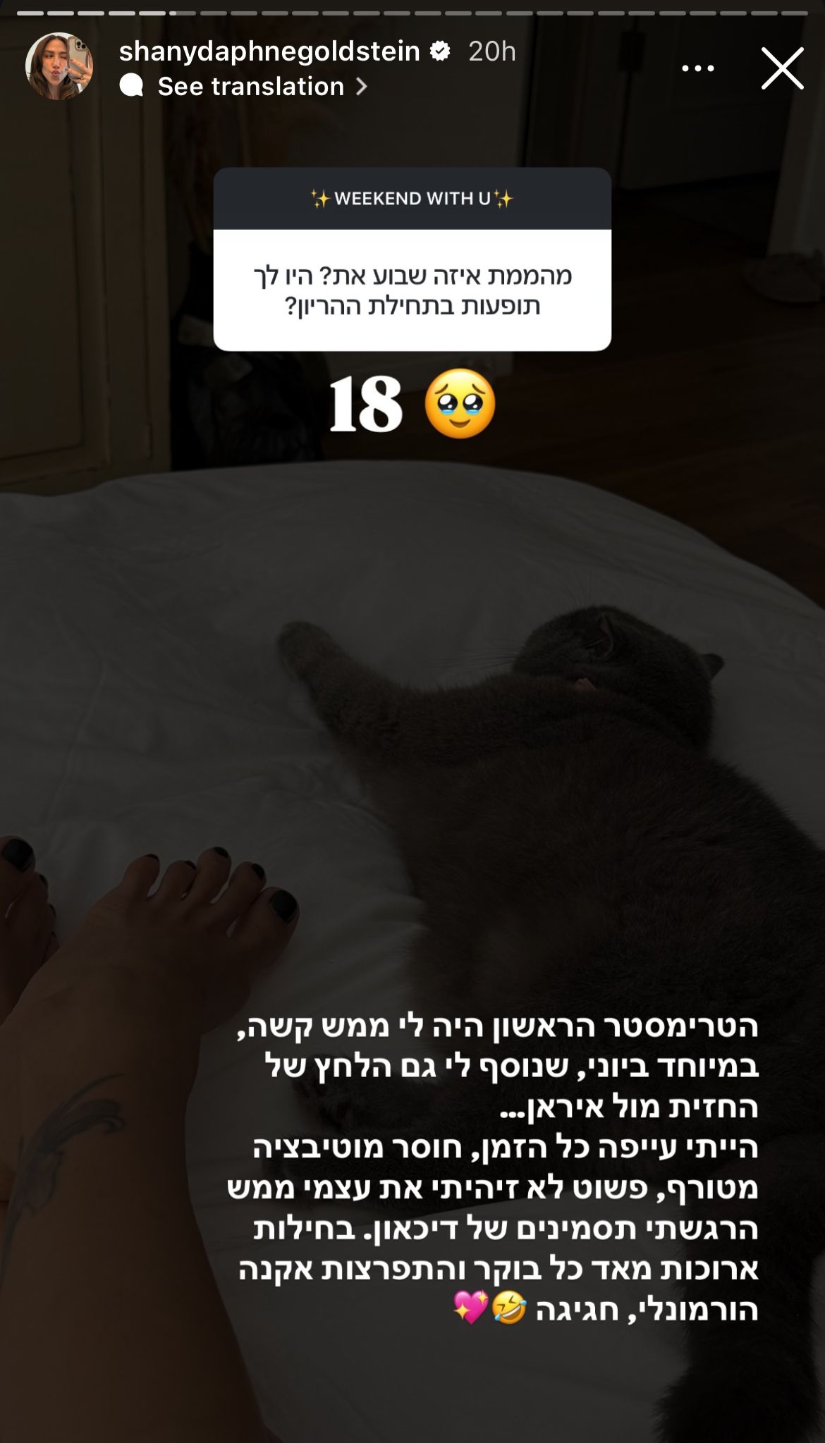 גולדשטיין, שנמצאת בחודש הרביעי להריונה, סיפרה על הטרימסטר הראשון והקשוח שעברה: "היה לי ממש קשה, במיוחד ביוני שנוסף לי גם הלחץ של החזית מול איראן", כתבה ושיתפה: "הייתי עייפה כל הזמן, חוסר מוטיבציה מטורף, לא זיהיתי את עצמי והרגשתי תסמינים של דיכאון".