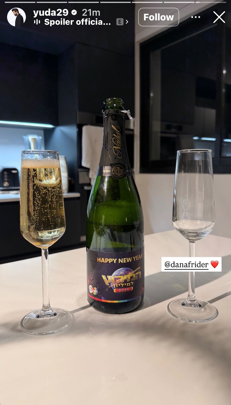 2026 כבר כמעט פה וכל הכוכבים עושים הכנות אחרונות לקראת חגיגות השנה האזרחית החדשה שלהם. זוג אחד שיקבל את השנה בצורה קצת שונה הפעם הם יהודה לוי ודנה פרידר, כשבגלל ההיריון רק אחד מהם יכול לציין אותה עם משקה אלכוהולי ביד. בסטורי שהעלה לחשבון האינסטגרם שלו, לוי שיתף בשי שקיבל לקראת העונה החדשה של "המירוץ למיליון" (בקרוב, קשת 12) ברמז להתאמות הנדרשות.