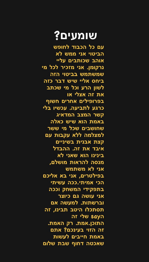 "אני מזכיר לכל מי שמשתמש בביטוי הזה ביחס אליי שיש דבר כזה לשון הרע וכל מי שכתב את זה אצלי או בפרופילים אחרים חשוף כרגע לתביעה", המשיך. "המצב המדאיג באמת הוא שיש כאלה שחושבים שכל מי ששר למצלמה ללא עקבות (הטעות במקור), עם קצת אבנית בשיניים, איבד את זה".
