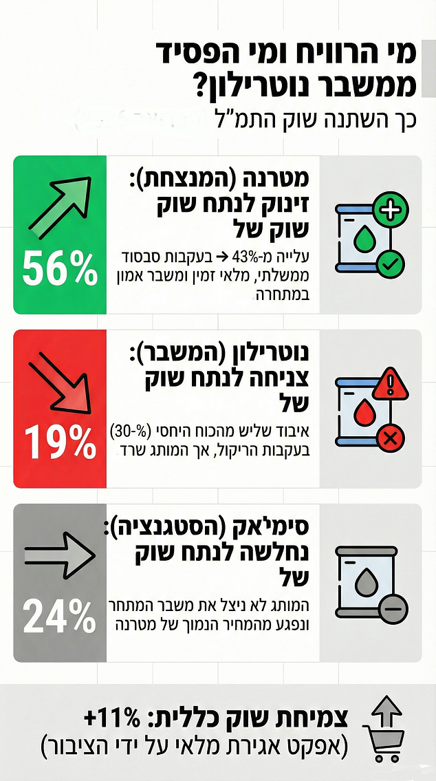 ד"ר חזי גור-מזרחי, ראש המכון לחקר הקמעונאות, השווה נתוני מכירות בין השבוע הראשון של נובמבר 2025 לבין השבוע הראשון של פברואר 2026. הממצאים מראים ירידה ברורה אך לא דרמטית כפי שציפו רבים: נתח השוק של נוטרילון צנח מכ-30% לכ-19%. מטרנה עלתה מכ-43% לכ-56%, וסימילאק דווקא נשחקה מכ-28% לכ-24%.
