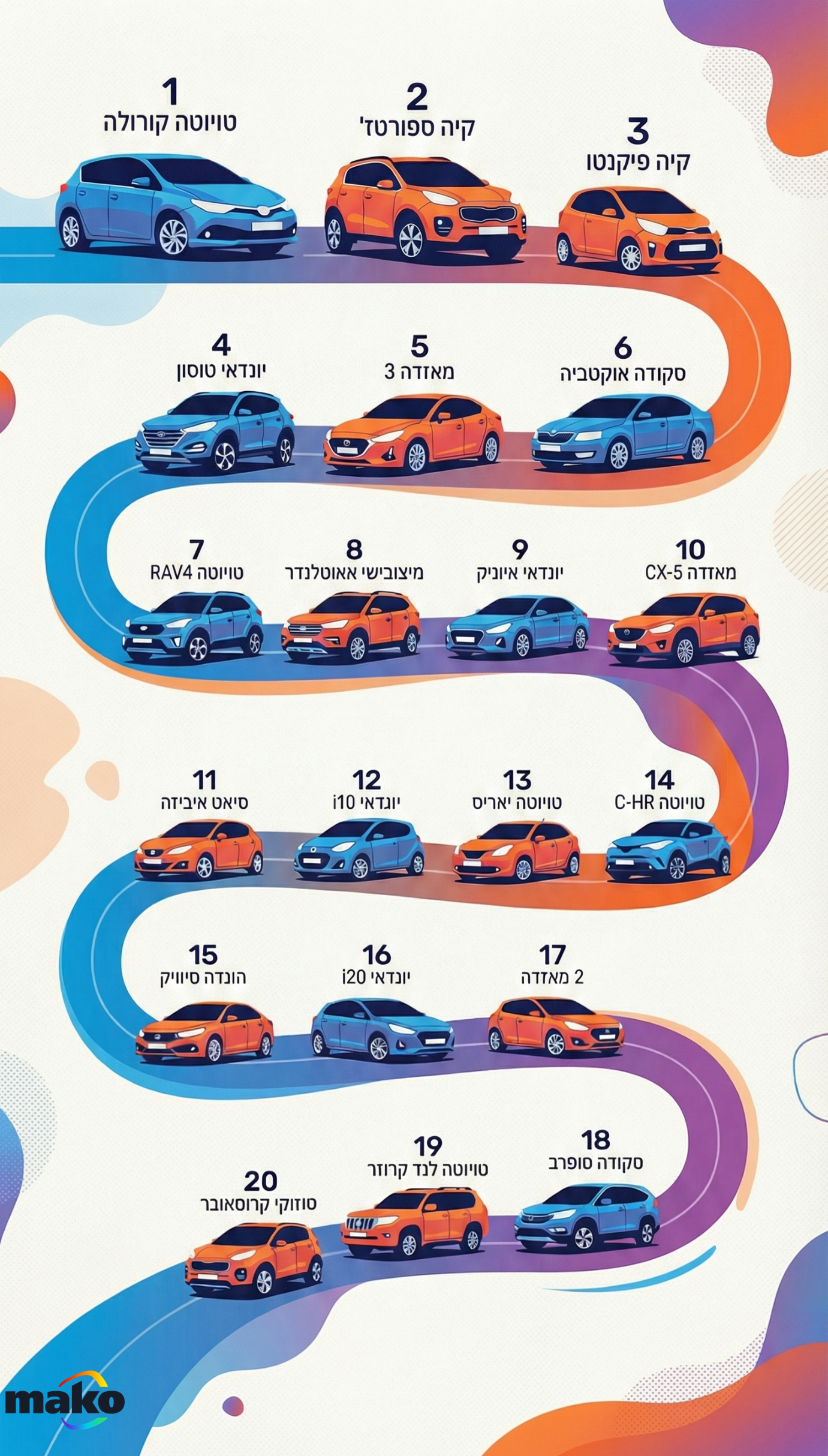 בהשוואה לשנת 2024 יש מעט מאוד תזוזות בצמרת. טויטה קורולה שומרת על הדירוג שלה בפסגה ולא זזה משנה שעברה. גם קיה ספורטז' שומרת בקנאות על המקום השני. לעומת זאת קיה פיקנטו עולה דירוג אחד ומתמקמת במקום שלישי. יונדאי טוסון עם עליה של 2 מקומות מהשנה שעברה מתברגת במקום רביעי בטבלה, ומאזדה 3 ממשיכה את המומנטום עם קפיצה של שני מקומות ומתמקמת חמישית.