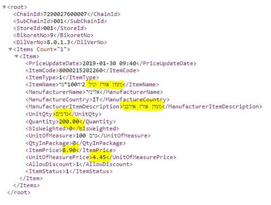 צילום מסך של קובץ מתוך אתר השוואת מחירים של משרד הכלכלה