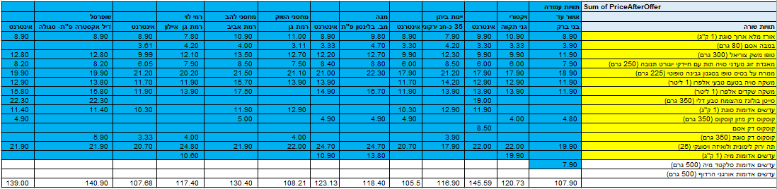 חשוב לציין כי בכל אחת מהרשתות ייתכנו מבצעים לעיתים, אך ההשוואה בוצעה עבור המחירים בזמן הבדיקה בלבד. כמו כן, ברשתות שבהם מוצר מסוים לא נמצא במלאי בזמן הבדיקה, נבדק מחירו של מוצר חלופי למשל אריזה במשקל קטן יותר או מוצר זהה ממותג שונה.