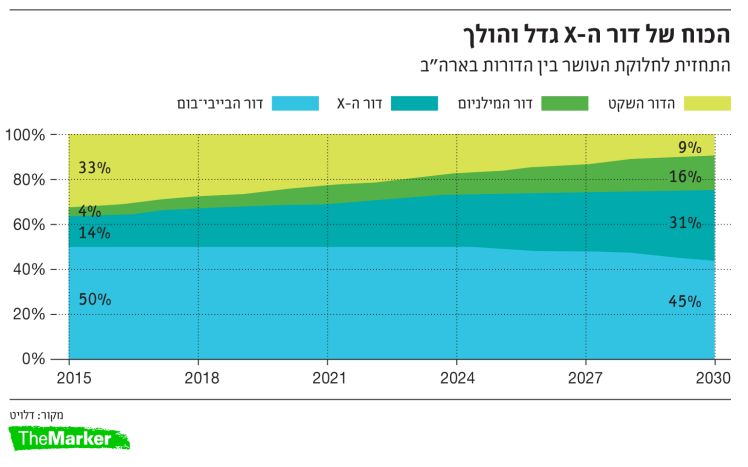 אבל אי־אפשר להתעלם גם מצד ההיצע - הכסף הזמין לצריכה, לחיסכון ולהשקעות. לפי מחקר שערכה חברת הייעוץ דלויט, בני דור ה-X בארה"ב יחוו את עליית העושר הגדולה ביותר ב-15 השנים הקרובות לעומת הדורות האחרים. חלקם בעושר של ארה"ב יגדל מ-15% כיום ל-31% עד 2030. זה יקרה מאחר שבני דור ה-X, עם צעירי הבייבי־בומרס, יתפסו את המשרות הבכירות בעלות ההכנסה הגבוהה ביותר. עד 2030 יאבדו הבייבי־בומרס חלק מעושרם, אך עדיין ישמרו על 45% מהעושר. ירידה חדה תחול מדרך הטבע בדור השקט, שחלקם ייפרדו מהעולם. חלקו של הדור השקט בעושר יירד מ-33% ל-9% עד 2030.