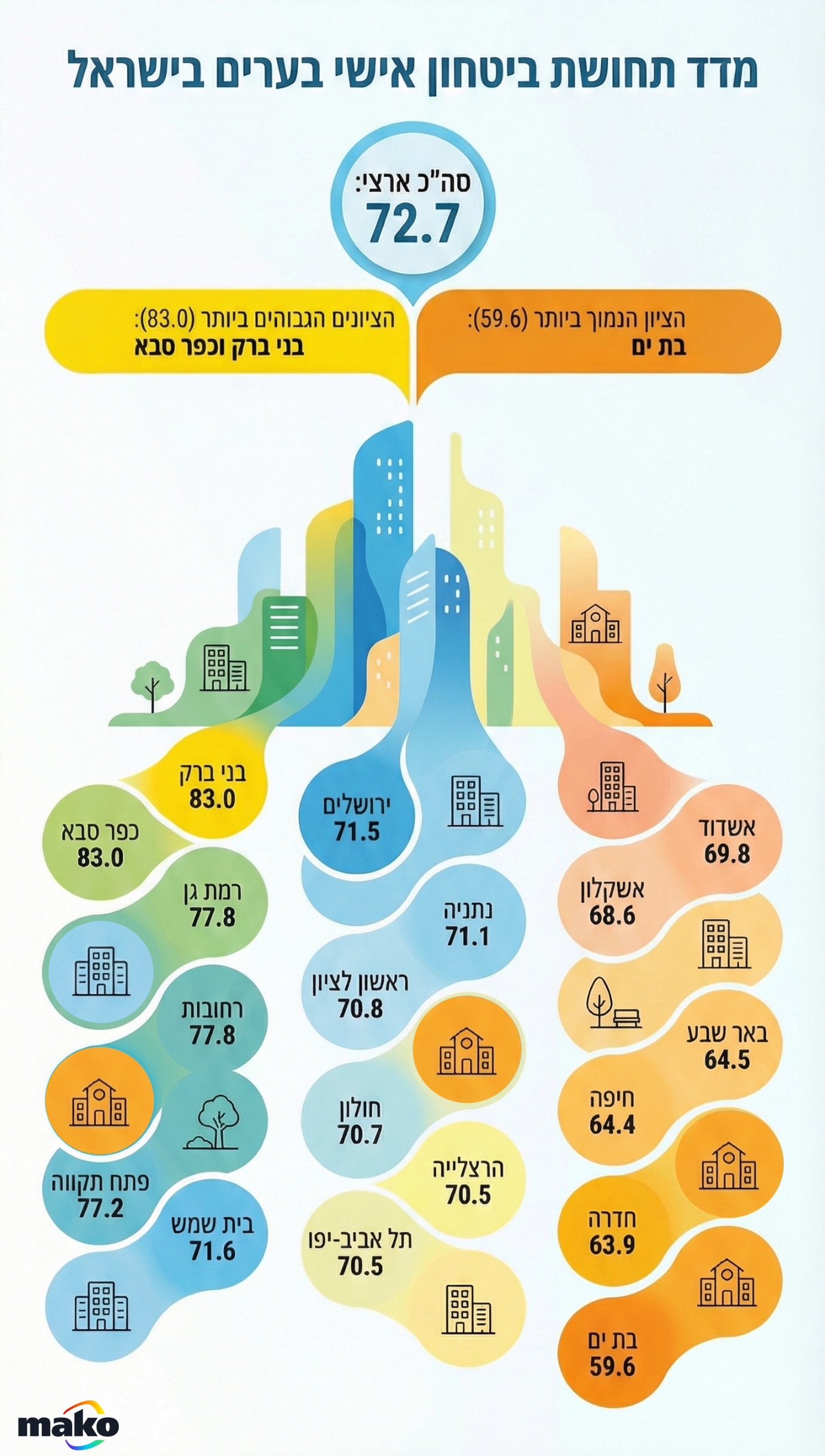 הקצה התחתון כבר מספר סיפור מטריד. באר שבע עומדת על 64.5%, חיפה על 64.4%, חדרה על 63.9%. אלו לא מספרים שמרמזים על עיר "לא בטוחה", אבל הם כן מצביעים על חוויית רחוב אחרת בשעות החשכה, פחות נינוחה, פחות מובנת מאליה. ובסוף, בת ים עם 59.6% בלבד, פער של יותר מ-23 נקודות מכפר סבא. זה מסוג הנתונים שמדגיש גם את אורח החיים של התושבים: לא רק איפה גרים, אלא איך חיים את העיר אחרי השקיעה.