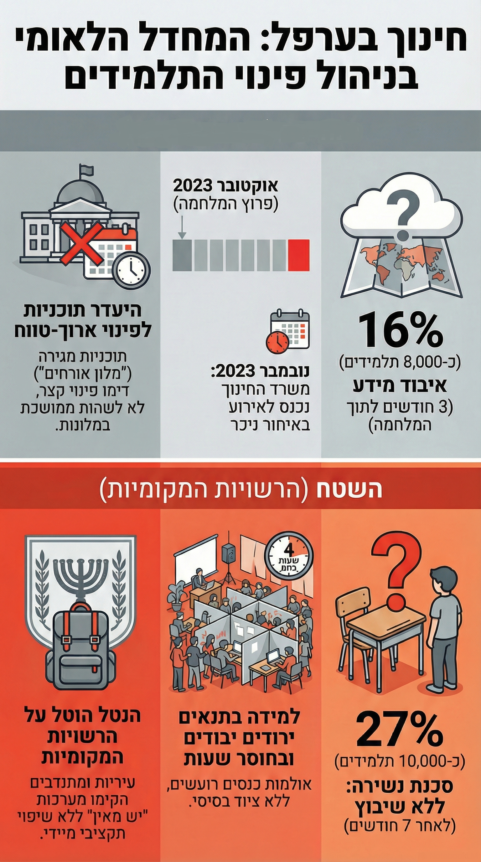 מחדל נפרד ולא פחות חמור בדוח עוסק בקריסת מערכת החינוך. משרד החינוך נכנס לתמונה באופן מלא רק בנובמבר 2023, שבועות ארוכים לאחר פרוץ המלחמה. בשלושת השבועות הראשונים והקריטיים הוא כמעט ולא נכח בשטח. לא היו הנחיות לחלוקת סמכויות, לא הוגדרו ממשקי עבודה בין רשות מפונה לרשות קולטת, ונוצר מה שהדוח מתאר כ"מערב פרוע" ארגוני.