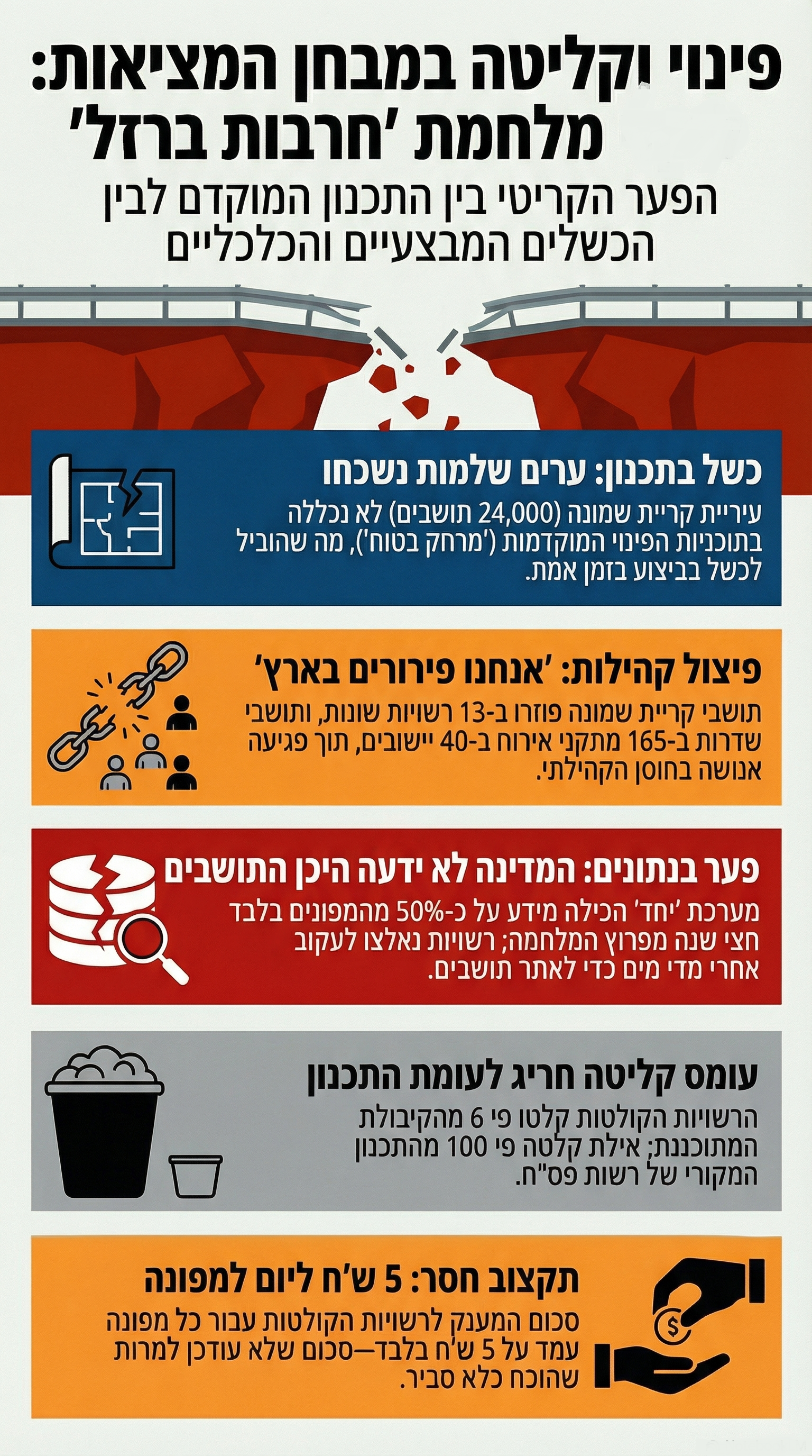 ההיבט הכלכלי לא פחות חמור. המענק שנקבע לרשות קולטת עמד על חמישה שקלים ליום למפונה, סכום שהדוח קובע כלא סביר. שמונה רשויות דיווחו על הפסדים של כ-55 מיליון שקלים, ותאגידים עירוניים איבדו כ-123 מיליון שקלים ללא שיפוי ייעודי. כספי השיפוי הועברו רק בסוף דצמבר 2023, עיכוב שיצר קשיי תזרים חמורים לרשויות חלשות.