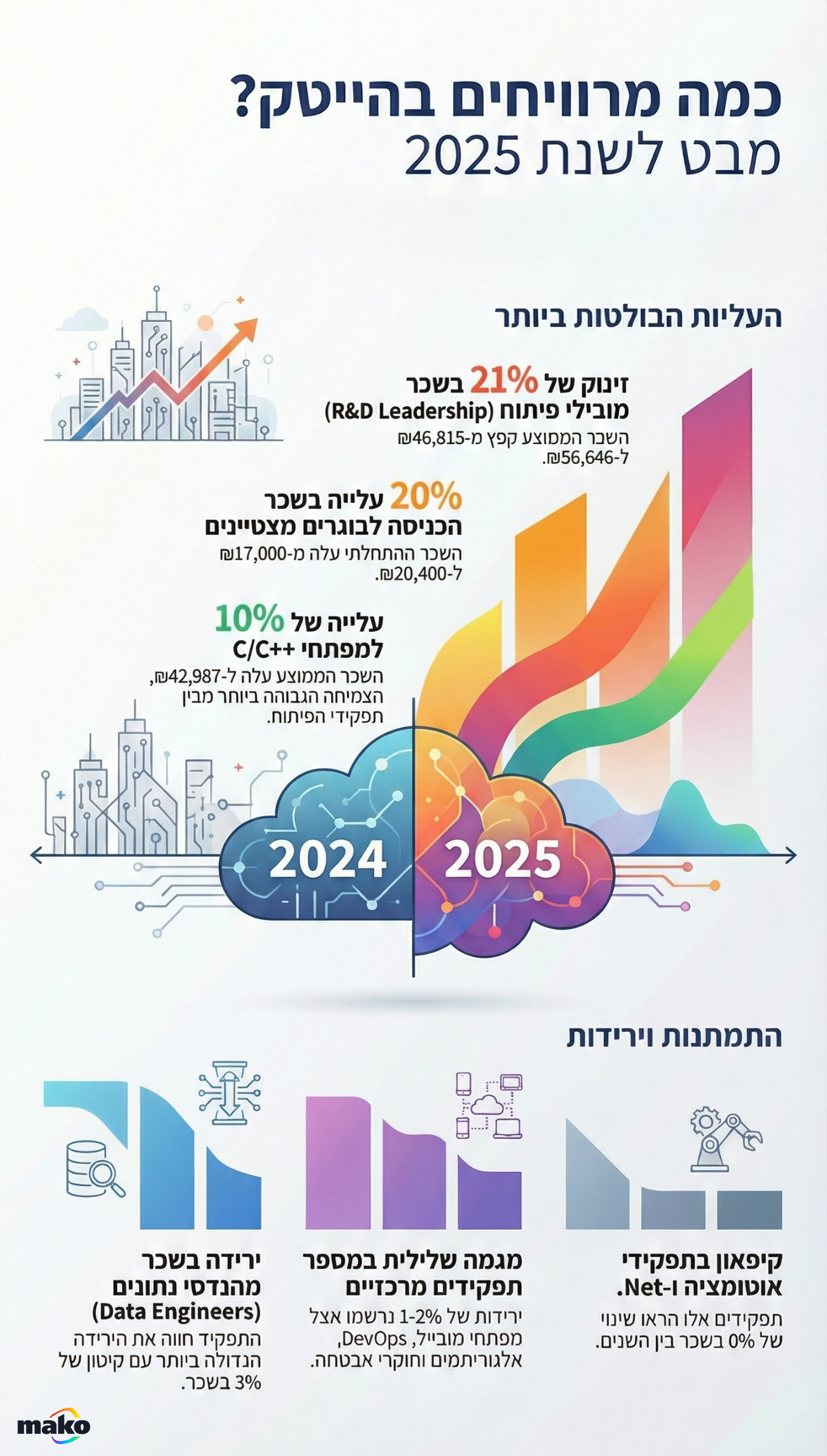 בדרג הניהולי נרשמה עלייה חדה של 21% בשכר. הדוח מייחס את העלייה לשני גורמים: גל סטארטאפים חדשים שקמו ב-2025 ומגייסים מנהלים מנוסים, וכניסת כלי AI לחברות גדולות שיצרה ביקוש למנהלים המתעדכנים בהתפתחויות הטכנולוגיות.