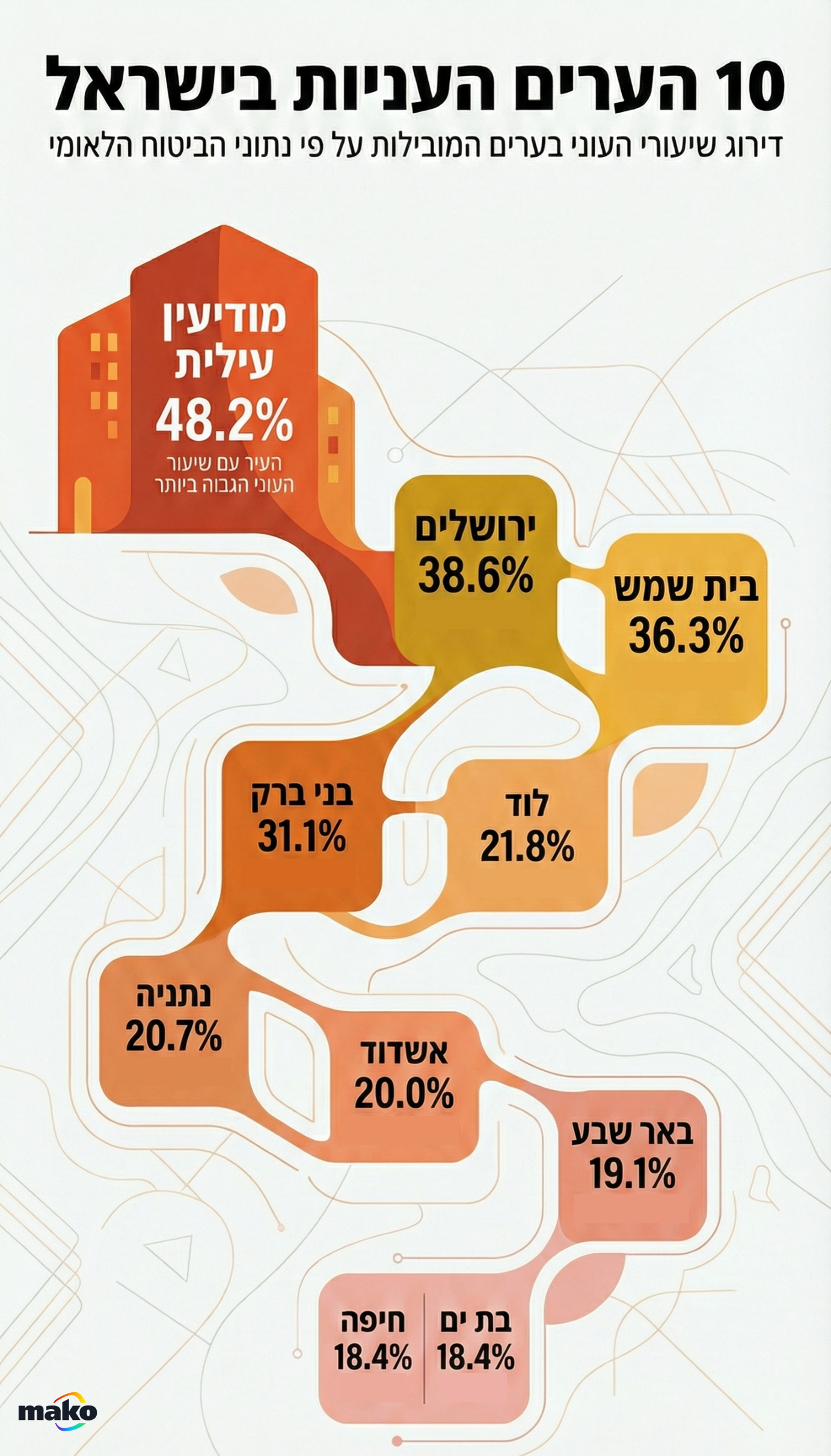 דוח העוני והאי-שוויון 2024 של הביטוח הלאומי מציג תמונה עגומה: שני מיליון ישראלים חיים מתחת לקו העוני, והפערים בין הערים הגדולות נותרו גדולים. במודיעין עלית מחצית מהמשפחות מוגדרות עניות, ובבני ברק אחת משלוש. רמת השרון היא העיר עם הכי פחות עניים בישראל. התחזית ל-2025 לא מעודדת