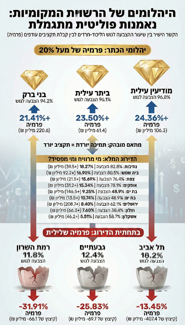 בערים החרדיות התמונה בולטת במיוחד. בית שמש, אלעד, ביתר עילית ומודיעין עילית נהנות מפרמיות שמגיעות לעיתים ליותר מ-40% מכלל התקציב הממשלתי שלהן.