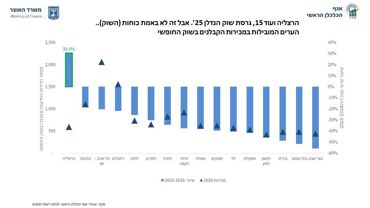 בתוך התמונה העגומה הזו בולטת עיר אחת שהצליחה לשחות נגד הזרם. הרצליה לא רק התברגה בצמרת הערים המובילות במכירת דירות חדשות בשנה שעברה, אלא גם רשמה גידול של 30% במכירות. היא הגיעה למקום השלישי, מיד אחרי ירושלים ותל אביב.