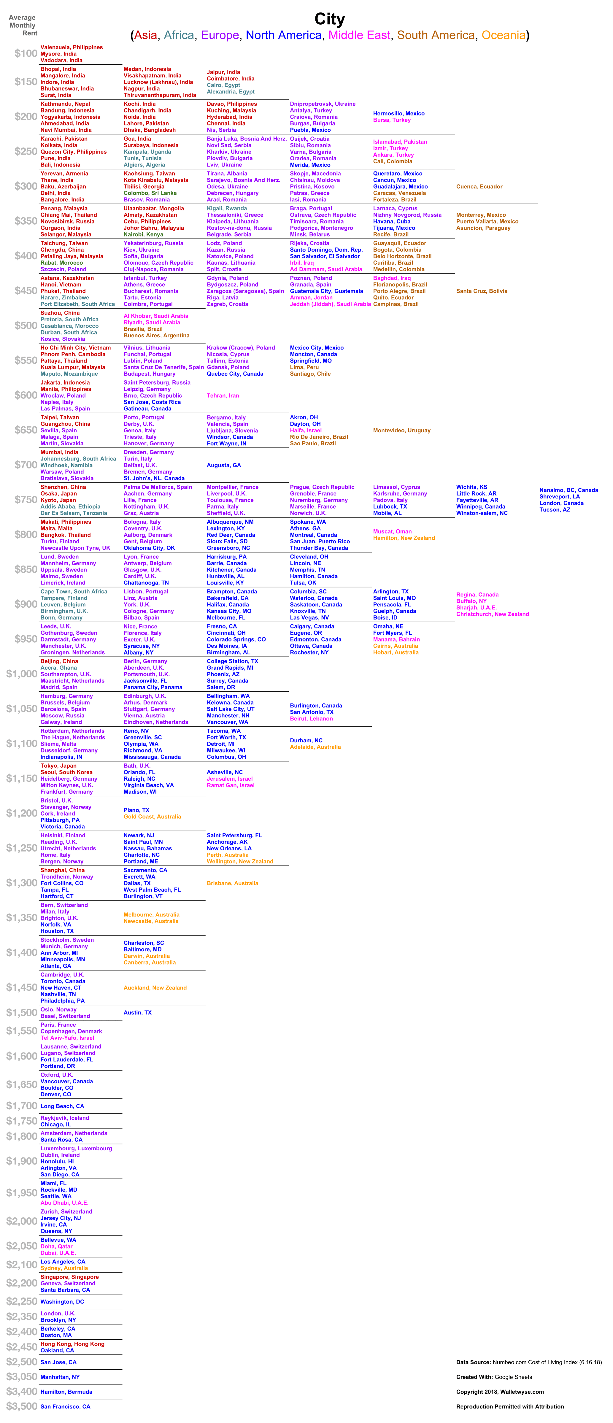 אז בדיוק עבור מי שתוהים לעצמם בדיוק עד כמה המצב שלהם היה משתפר לו התגוררו ביעד אחר, הומצאו טבלאות השוואת מחירי שכירות, שבוחנות מה עלות של דירה בשלל ערים בעולם. כמו זו, למשל, של משתמש רדיט בשם הקליט kylekun513, שערך טבלה עם מחירי שכירות של 540 ערים בעולם, החל ב-100 דולר לחודש ועד 3,500, ואותה הוא סידר גם לפי יבשות, עבור המתקשים. הטבלה ההשוואתית של אתר Rent café, לעומת זאת, מרכזת נתוני שכירות מ-30 ערים שהן מרכזים כלכליים עולמיים, פחות סלאמז בעולם השלישי.