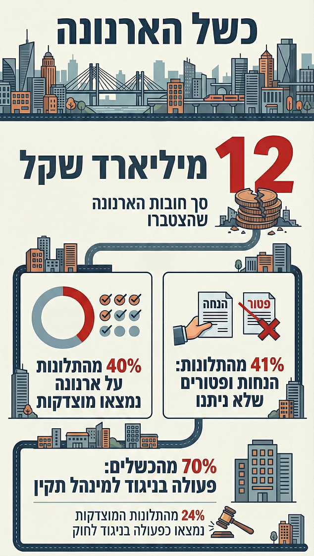 דו"ח מיוחד של נציבות תלונות הציבור מגלה: 40% מהתלונות על ארנונה נמצאו מוצדקות, ובינתיים הצטברו חובות של 12 מיליארד שקלים. ב-70% מהתלונות המוצדקות הרשויות פעלו בניגוד לכללי מינהל תקין, וברבע מהן בניגוד לחוק