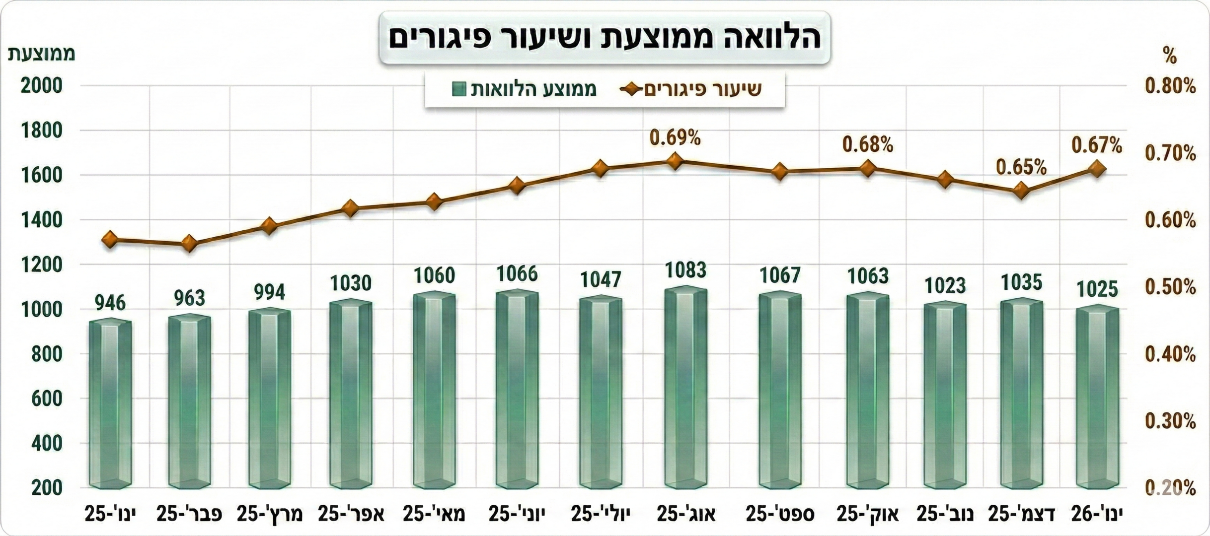 סכום ההלוואה הממוצעת ירד מעט בינואר, אך מאז נובמבר נשמרת יציבות סביב 1.03 מיליון שקל, ללא שינוי מהותי ברמות המינוף. הנתון מעיד על כך שרמת הביקוש לא השתנתה באופן דרמטי, גם אם חלק מהלווים מתקשים לעמוד בהחזרים.