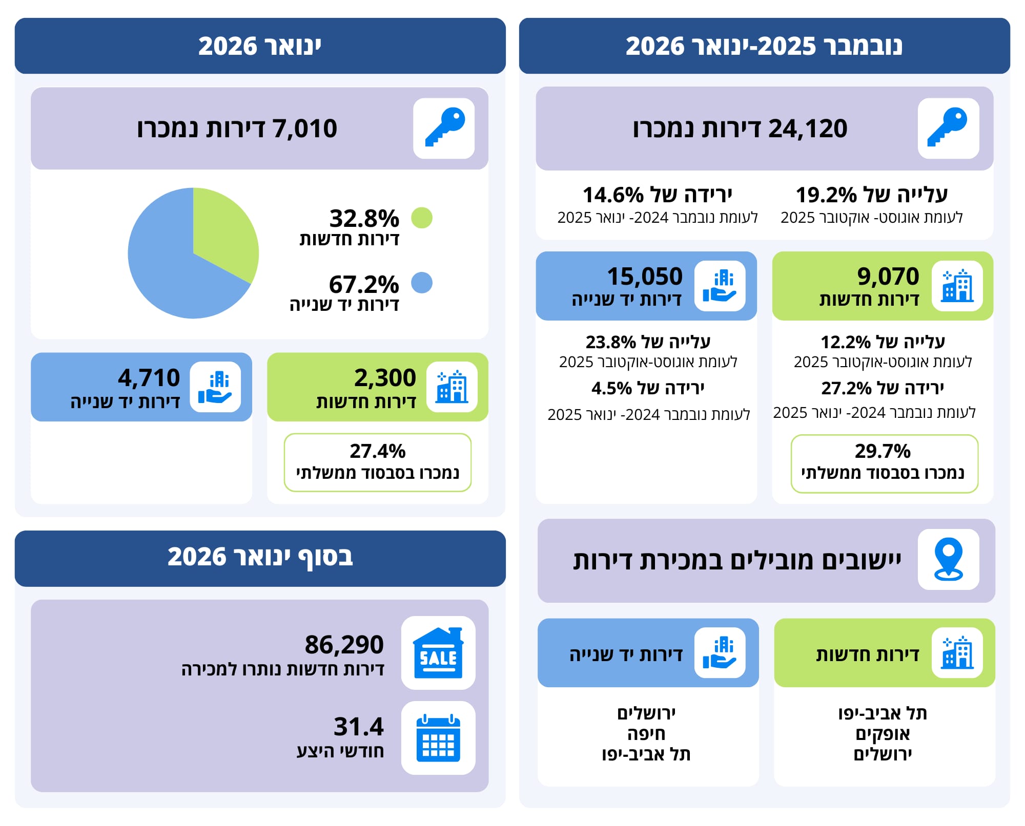 בחודש ינואר לבדו נמכרו כ-7,010 דירות: כ-4,710 דירות יד שנייה (67.2%) וכ-2,300 דירות חדשות (32.8%).