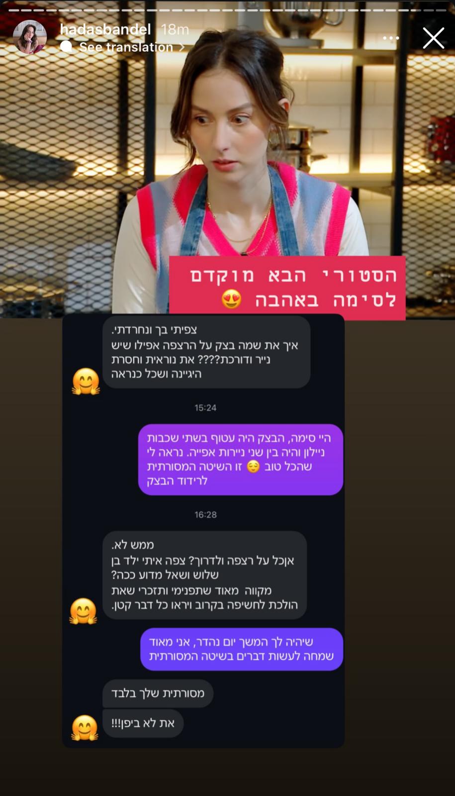 מהלך אחד שעשתה המתמודדת הדס בנדל במהלך הדו-קרב שלה, הצליח להרגיז את אחת העוקבות ששלחה לה הודעה זועמת. היא לקחה בצק של נודלס, עטפה אותו ורידדה על הרצפה, אך לא כולם היו מרוצים מהשיטה: "צפיתי בך ונחרדתי. חסרת היגיינה"