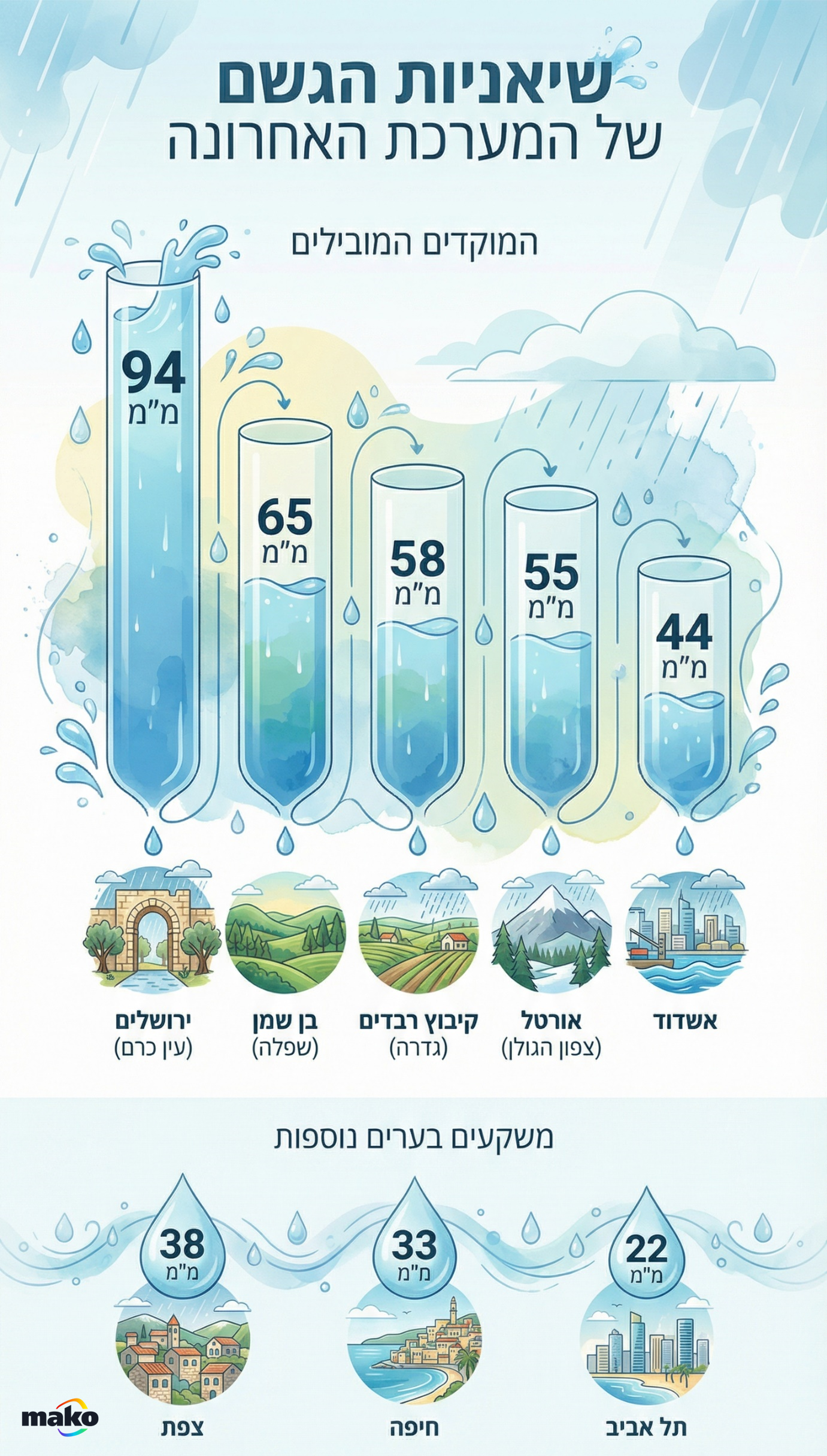 כמויות המשקעים מאתמול בערב ועד לשעה האחרונה: 55 מ"מ בקיבוץ אורטל (צפון הגולן), 38 מ"מ בצפת, 33 מ"מ בחיפה, 27 מ"מ בנתניה, 22 מ"מ בתל אביב, 65 מ"מ ביער בן שמן (שפלה), 58 מ"מ בגדרה, 44 מ"מ באשדוד ו-94 מ"מ בירושלים.