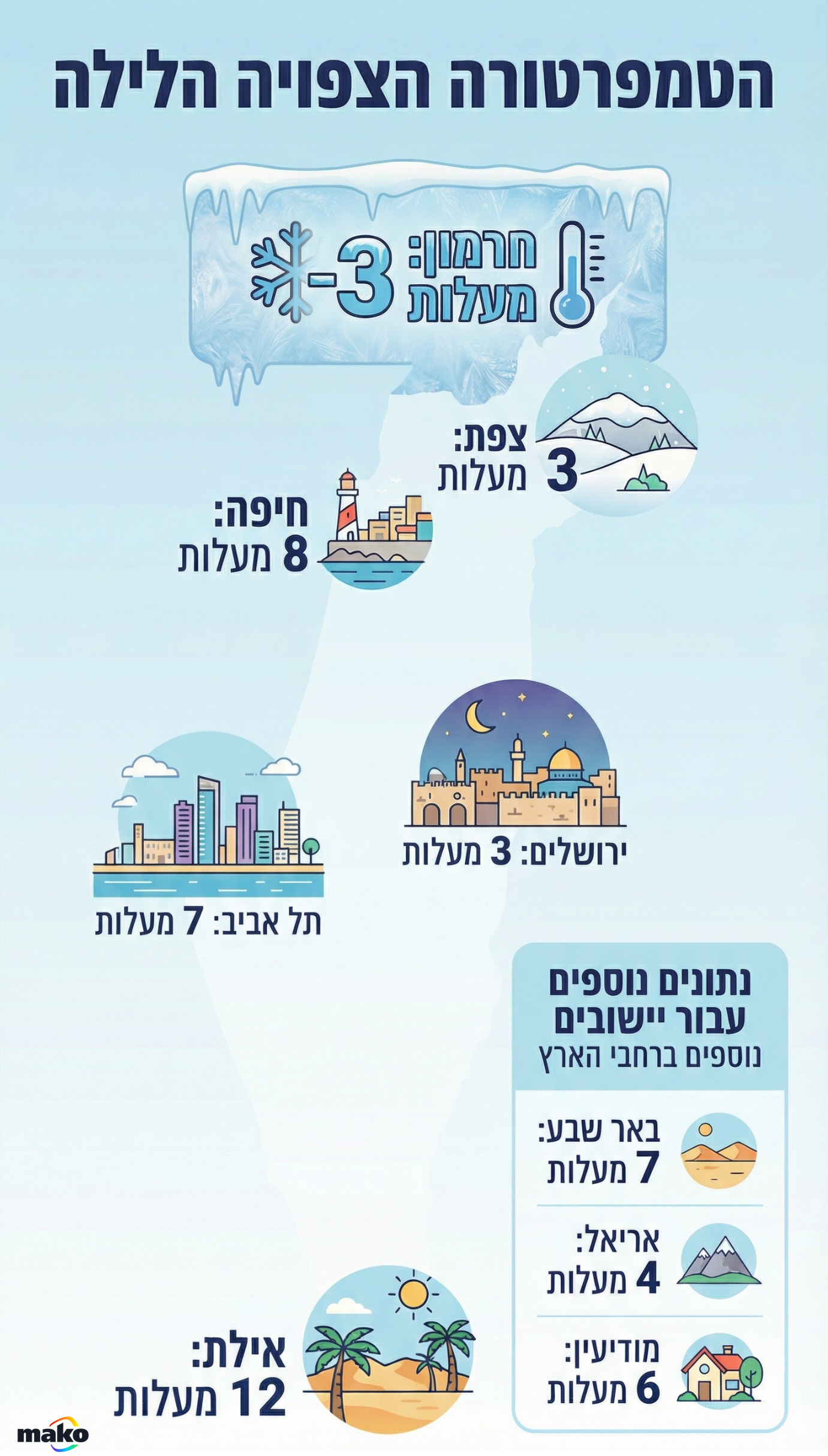 היום (שלישי) צפוי להמשיך ולהיות מעונן חלקית עד בהיר וקר מהרגיל לעונה. בלילה, כאמור, צפויה קרה במקומות המועדים. כמה קר יהיה?