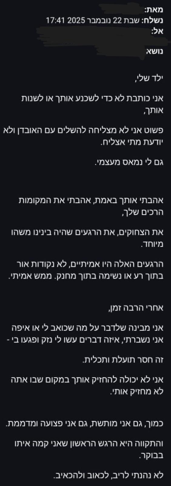 למרות השחרור, ר' מתקשה לחזור לשגרה. "יומיים ישבתי במעצר שווא. אני לא אותו אדם שהייתי", הוא אומר בכאב. "היא הרסה לי את החיים. עשתה הכול שאישאר איתה, וכשסירבתי – התלוננה שאנסתי. אני מפחד לצאת מהבית, לא רוצה ליצור קשרים עם נשים. חטפתי סטירה מצלצלת".