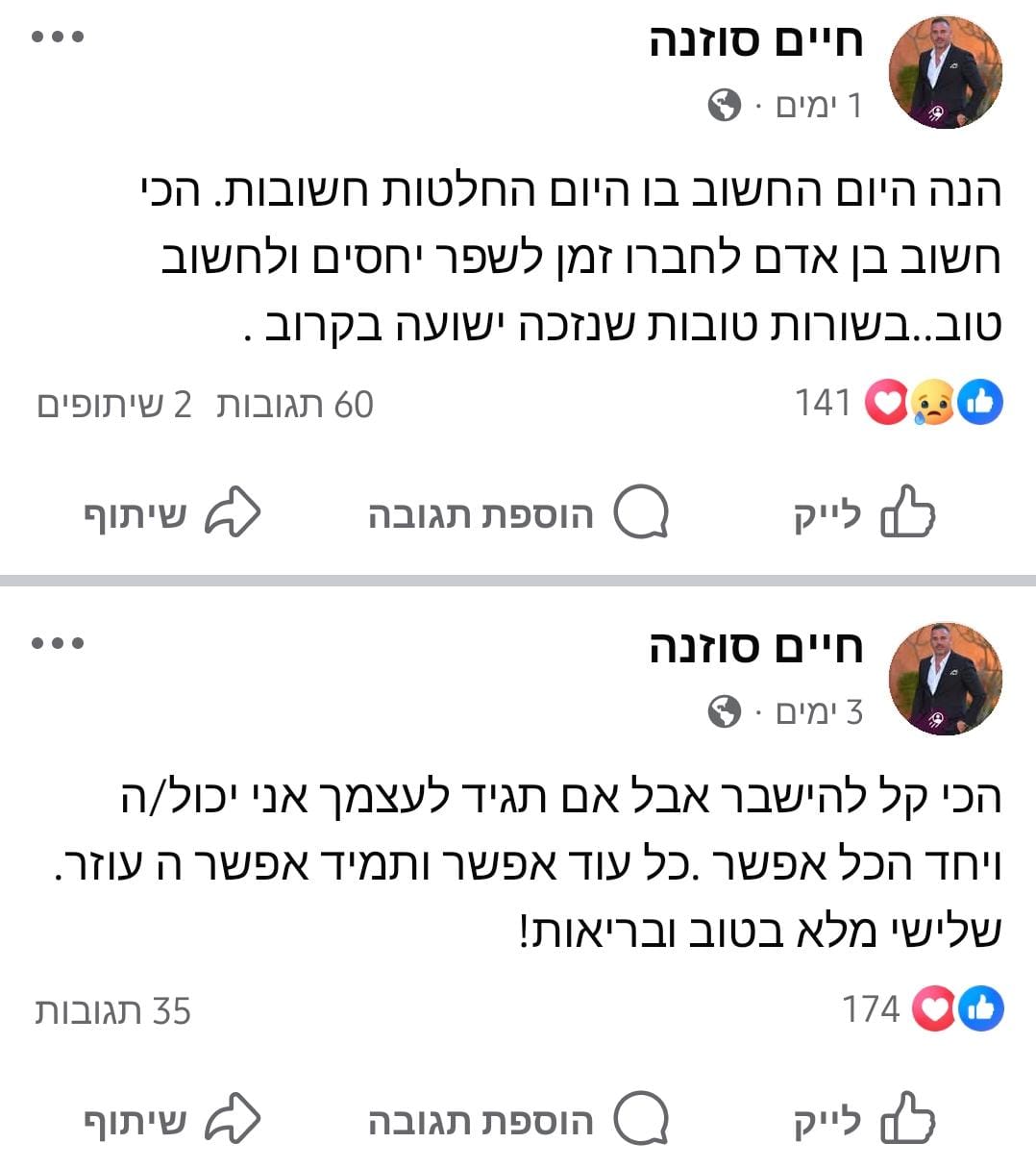 לפני יום הכיפורים עלה בדף הפייסבוק של סוזנה פוסט שבו נכתב: "הנה היום החשוב שבו החלטות חשובות. הכי חשוב בין אדם לחברו זמן לשפר יחסים ולחשוב טוב. בשורות טובות ושנזכה לישועות בקרוב". ימים בודדים קודם לכן, בפוסט אחר, נכתב: "הכי קל להישבר, אבל אם תגיד לעצמך אני יכול ויחד הכל אפשר. כל עוד אפשר ותמיד אפשר ה' עוזר".