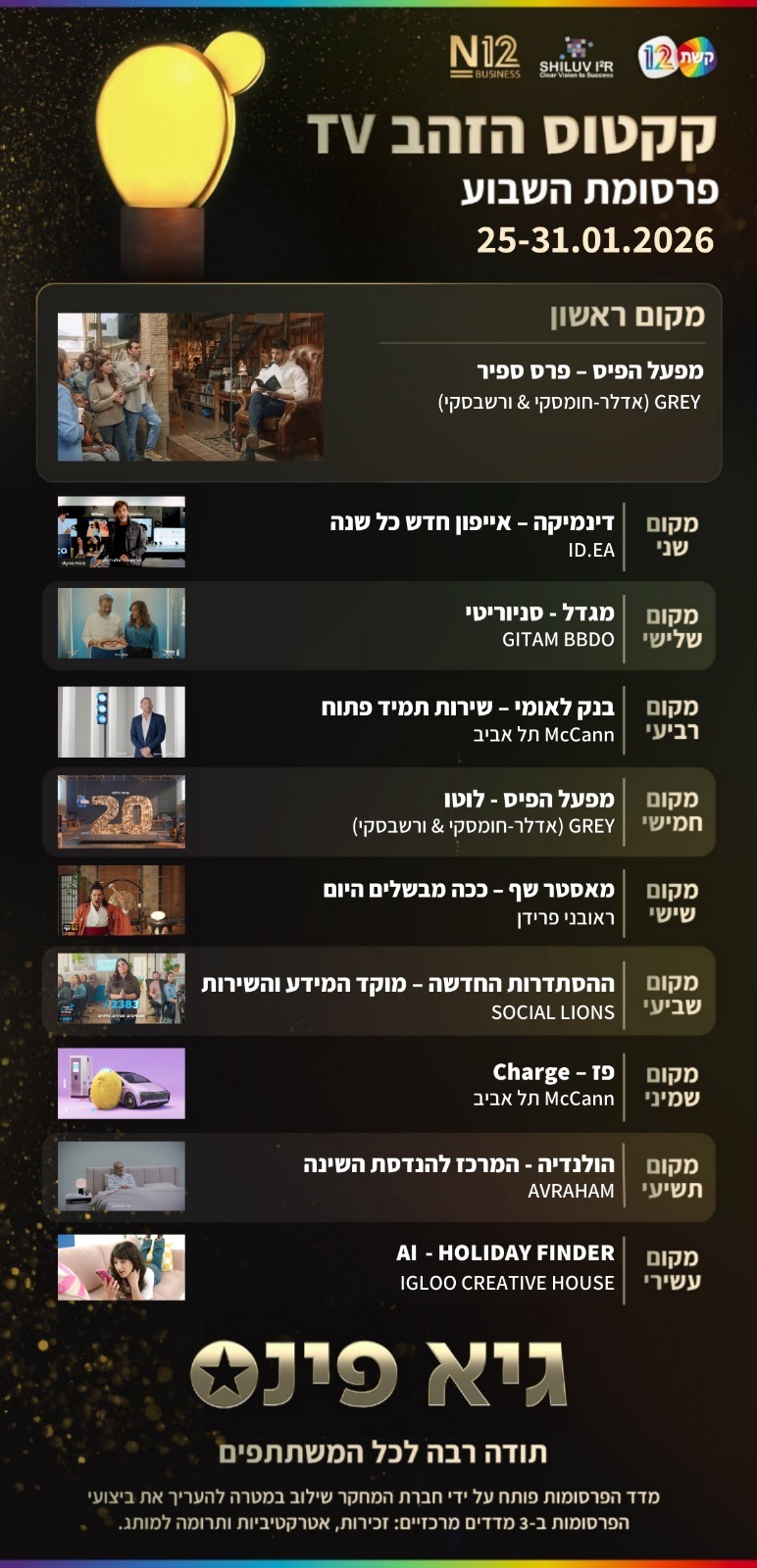 במקום הראשון מפעל הפיס ביוזמה מרגשת, אלי פיניש מבולבל מהמקום השני ובמקום השלישי מגדל מלווים אתכם באופן אישי. אלו הפרסומות שעשו לכם את השבוע