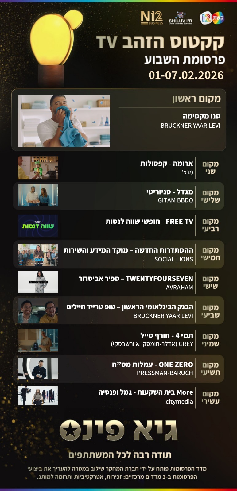 קקטוס הזהב 2026: קשת 12 וחברת המחקר "שילוב", מדרגות ומכתירות את הפרסומות האפקטיביות ביותר בטלוויזיה. המדד, המבוסס על חוות דעתם של מאות צופים, בוחן את הפרסומות לפי פרמטרים כמו זכירות, אטרקטיביות ותרומה למותג. בין שלל הפרזנטורים, המסרים והקמפיינים, מי היו הפרסומות שעשו לכולנו את השבוע?