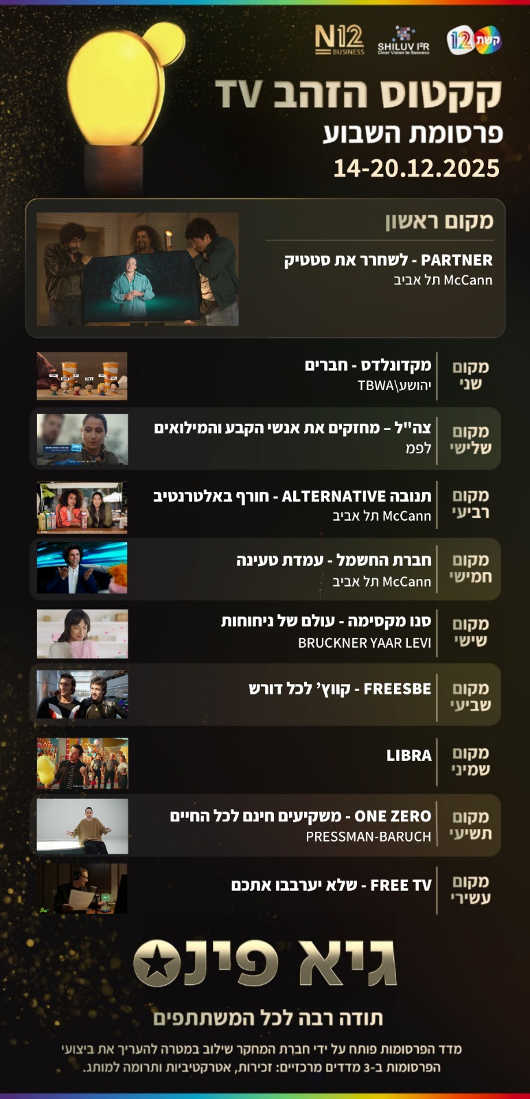 במקום הראשון: שלישיית מה קשור מגלים את פרטנר TVּ. במקום השני, מקדונלד'ס עם הארוחה של FRIENDS, ובמקום השלישי, צה''ל בקמפיין מרגש למשרתי הקבע והמילואים. אלו הפרסומות שעשו את השבוע